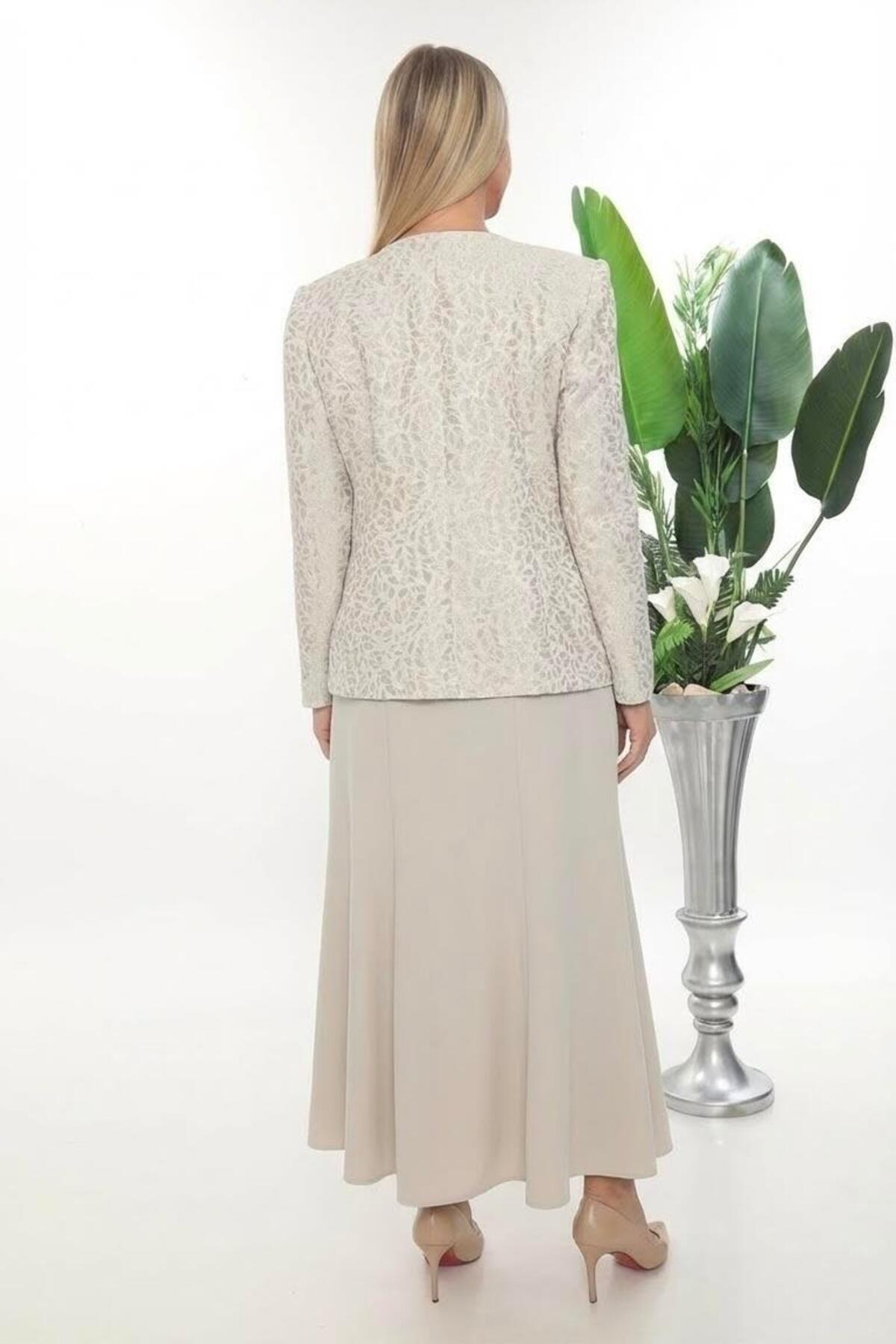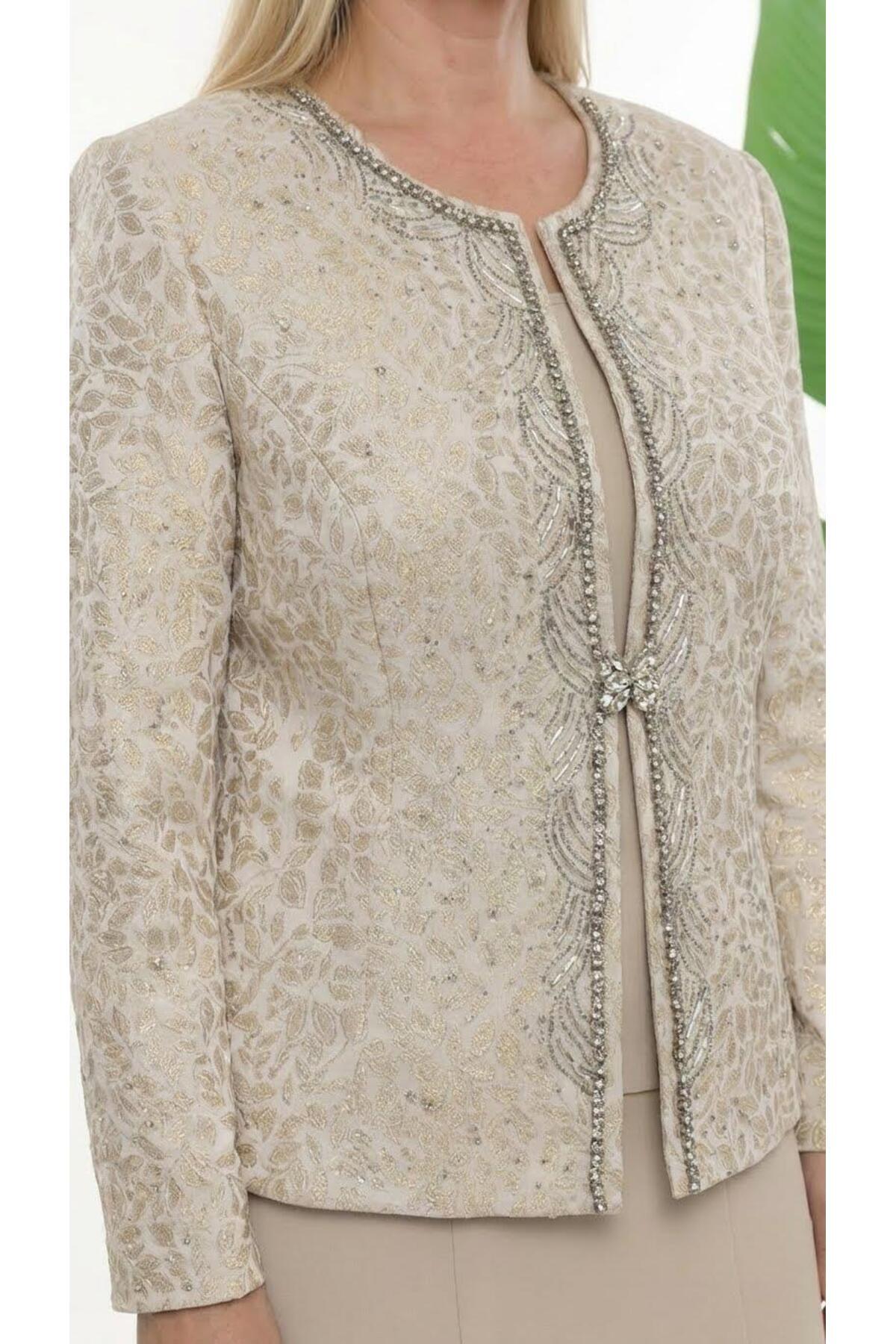 Şık Taş Detaylı Kapalı Yırtmaçlı Uzun Etekli Üçlü Takım