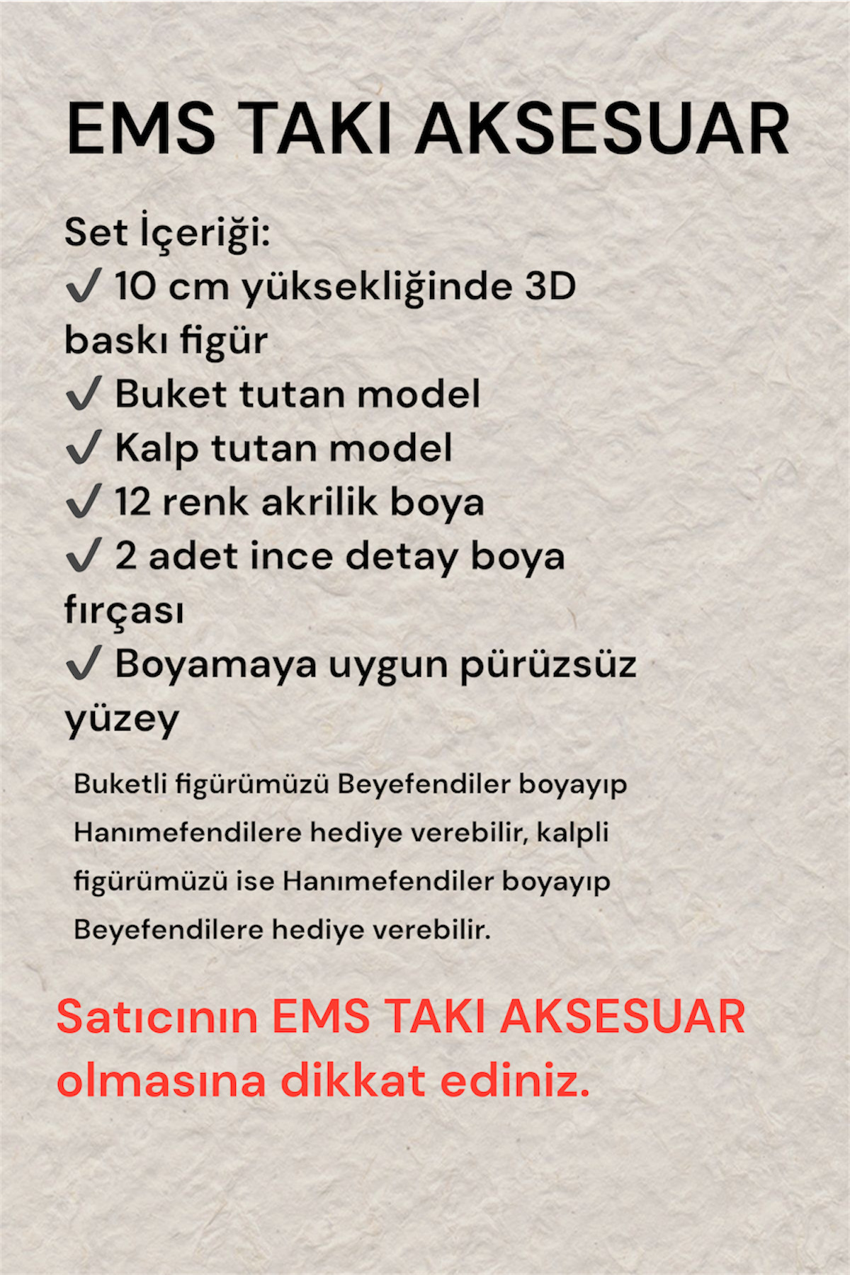 Set İçeriği:✔ 10 cm yüksekliğinde 3D baskı figür✔ Buket tutan model✔ Kalp tutan model✔ 12 renk akrilik boya✔ 2 adet ince detay boya fırçası✔ Boyamaya uygun pürüzsüz yüzeyAvantajları:✨ Romantik hediyeler ve özel günler için ideal✨ Hem yetişkinler hem çocuklar için eğlenceli aktivite✨ Tamamen size özel, kişisel bir tasarım oluşturma imkânı✨ Ev dekoru, hediye, hobi ve çift aktivitesi olarak mükemmelKendi dokunuşunuzu ekleyin, sevdiklerinize unutulmayacak bir hediye hazırlayın!