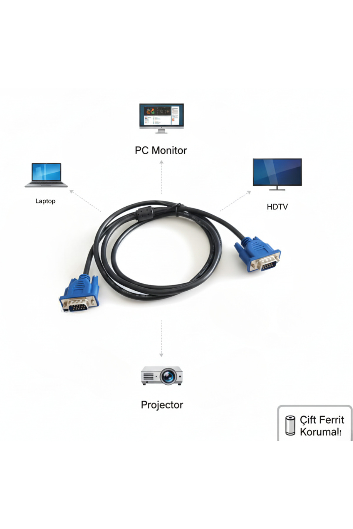 Gabble 1.5M VGA KABLOSU 3+2 LUX - Çift Ferrit Filtreli HD Monitör/Projeksiyon Uyumlu