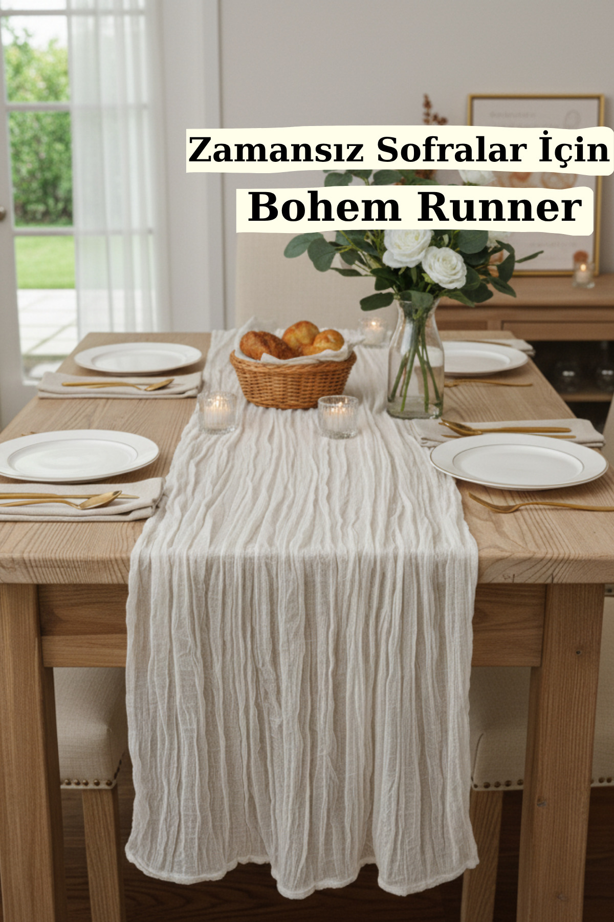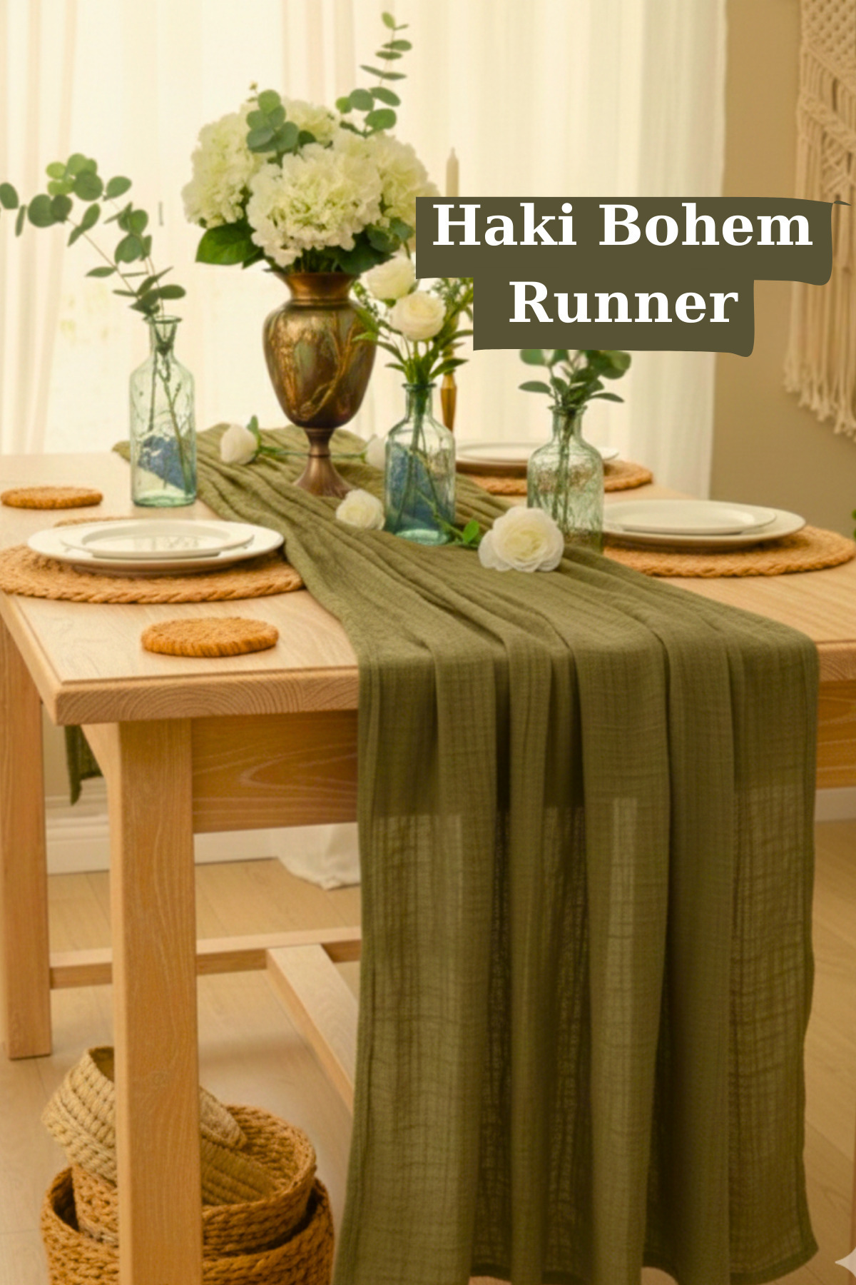 - Bohem tarzı masa örtüsü, doğal bej rengiyle ev dekorasyonunuza sıcak ve şık bir dokunuş katıyor.