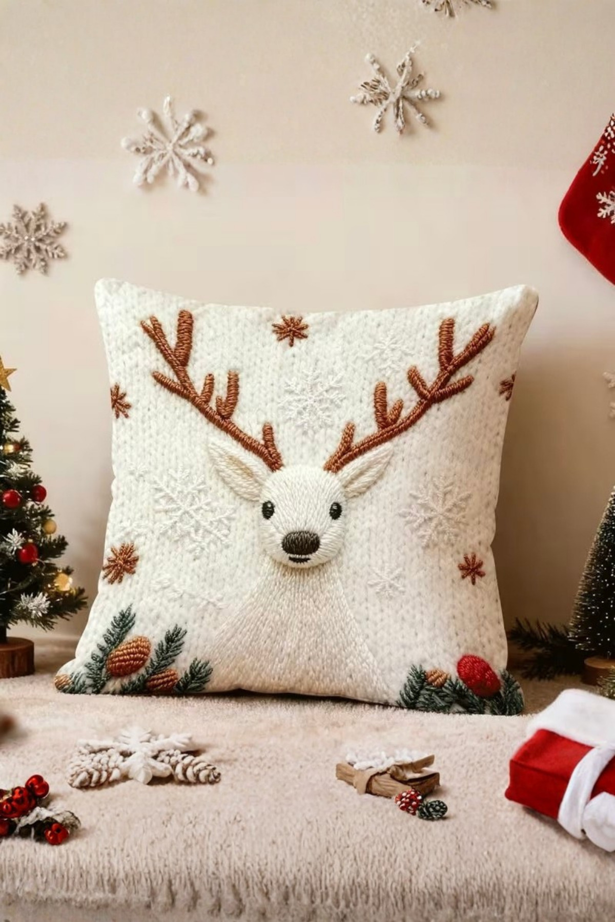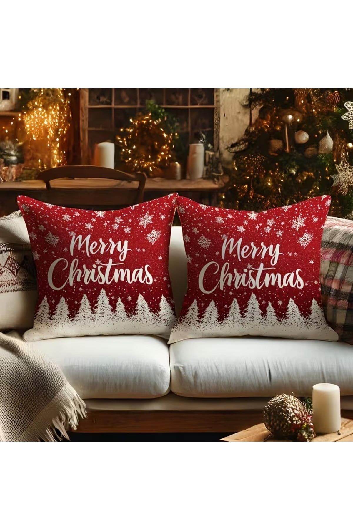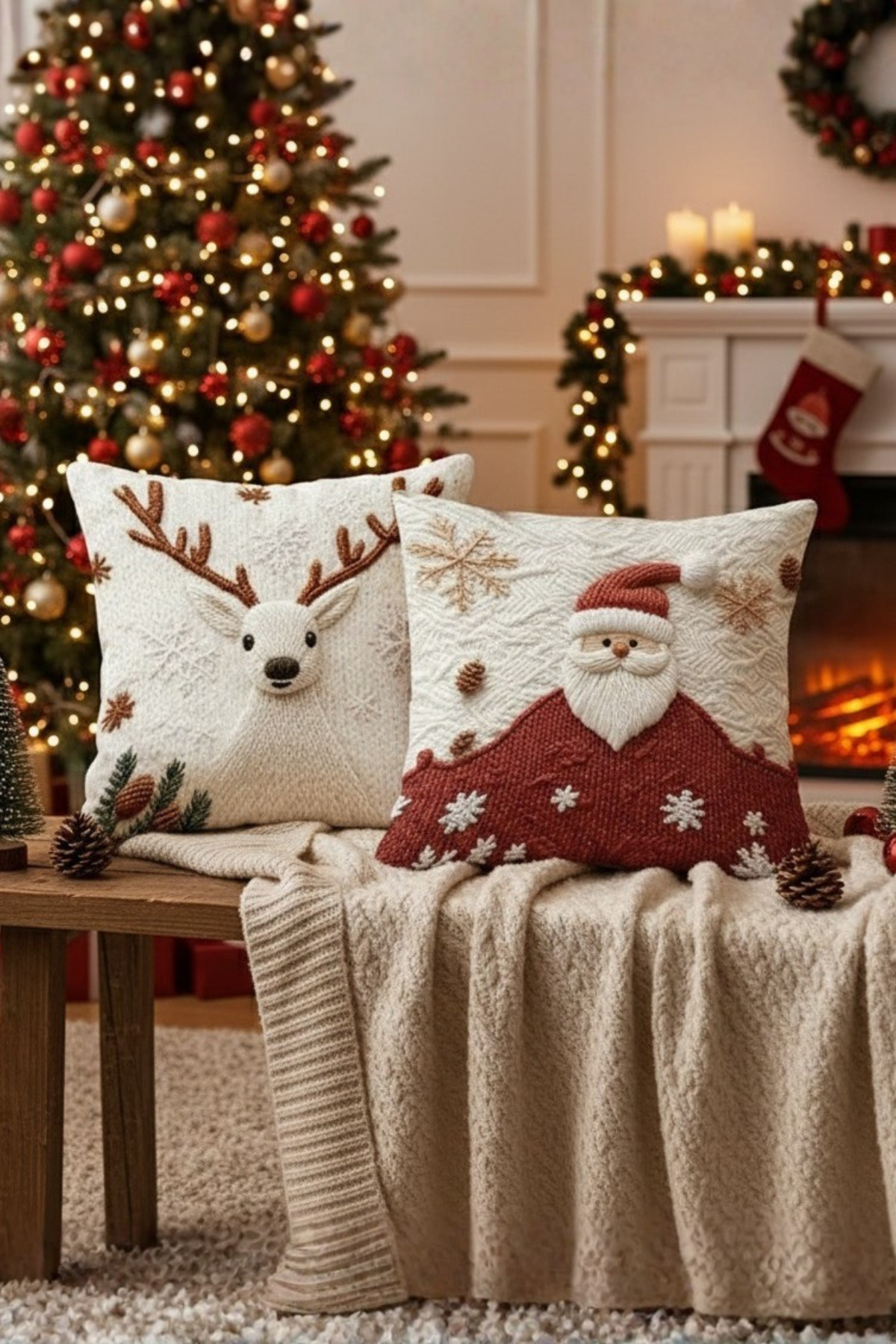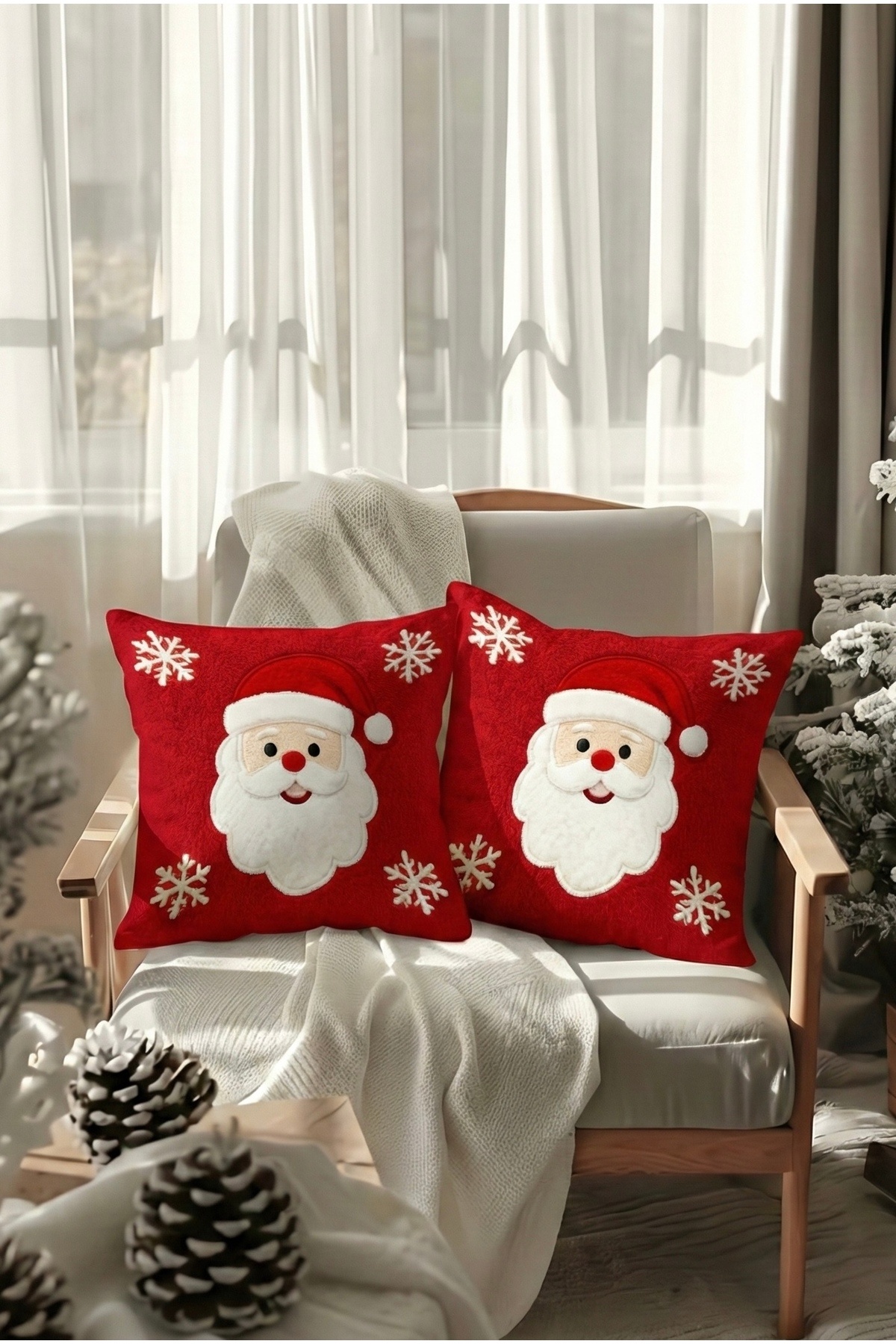 Noel Yastık Kılıfı, Noel Baba, Ren Geyiği & Kar Tanesi Desenli 2li Kırlent Yılbaşı Dekorasyon Hediye