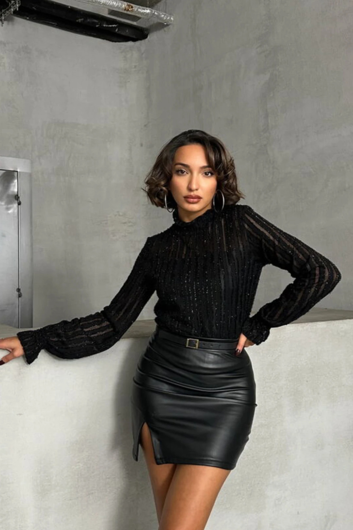 Dikey Dokulu Şeffaf Kol Detaylı Bluz