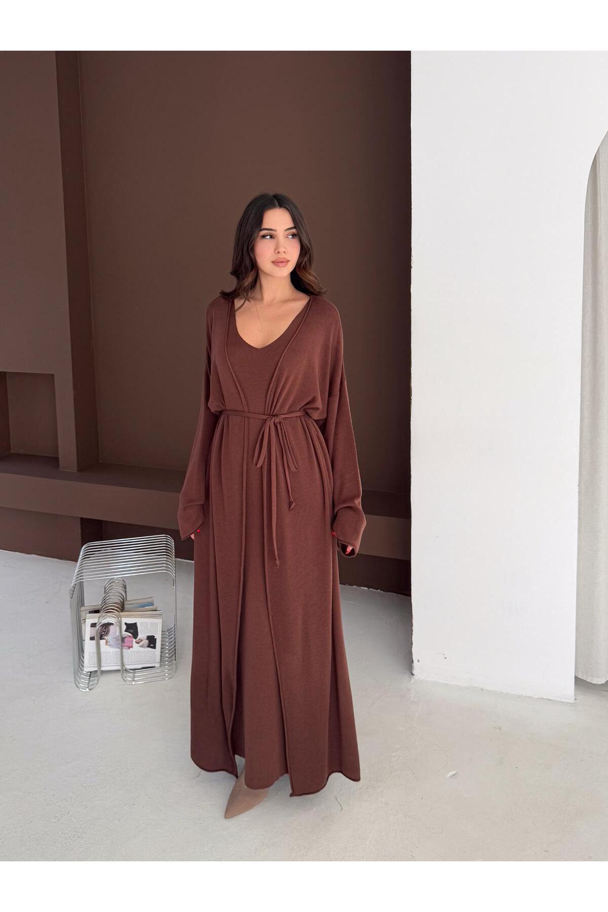 - Rahat ve şık tasarımıyla günlük kullanım için ideal, V yaka uzun elbise ve hırkalı triko takım.