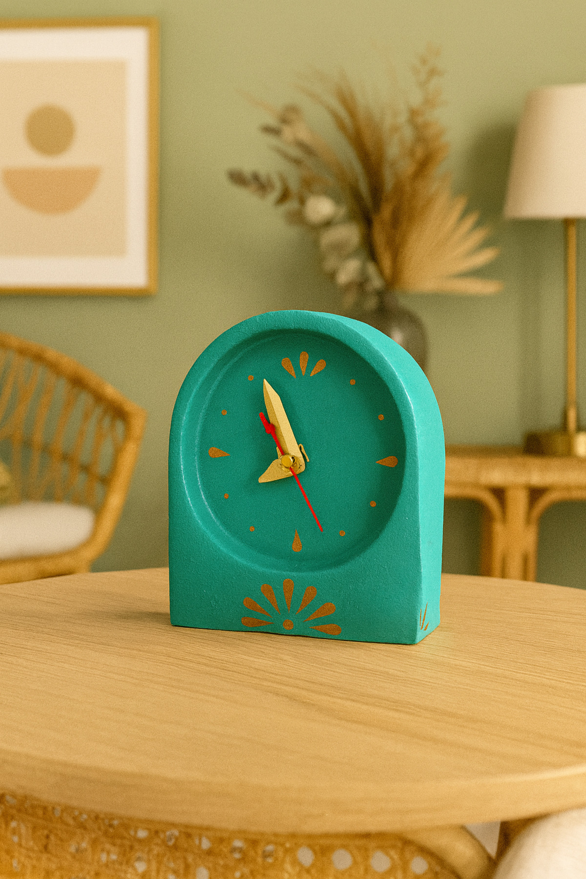 Yeşil gövdesi ve gold detaylarıyla öne çıkan bu masa saati, hem modern İskandinav tarzına hem de boho dekorasyona kolayca uyum sağlayan şık bir tasarıma sahiptir.