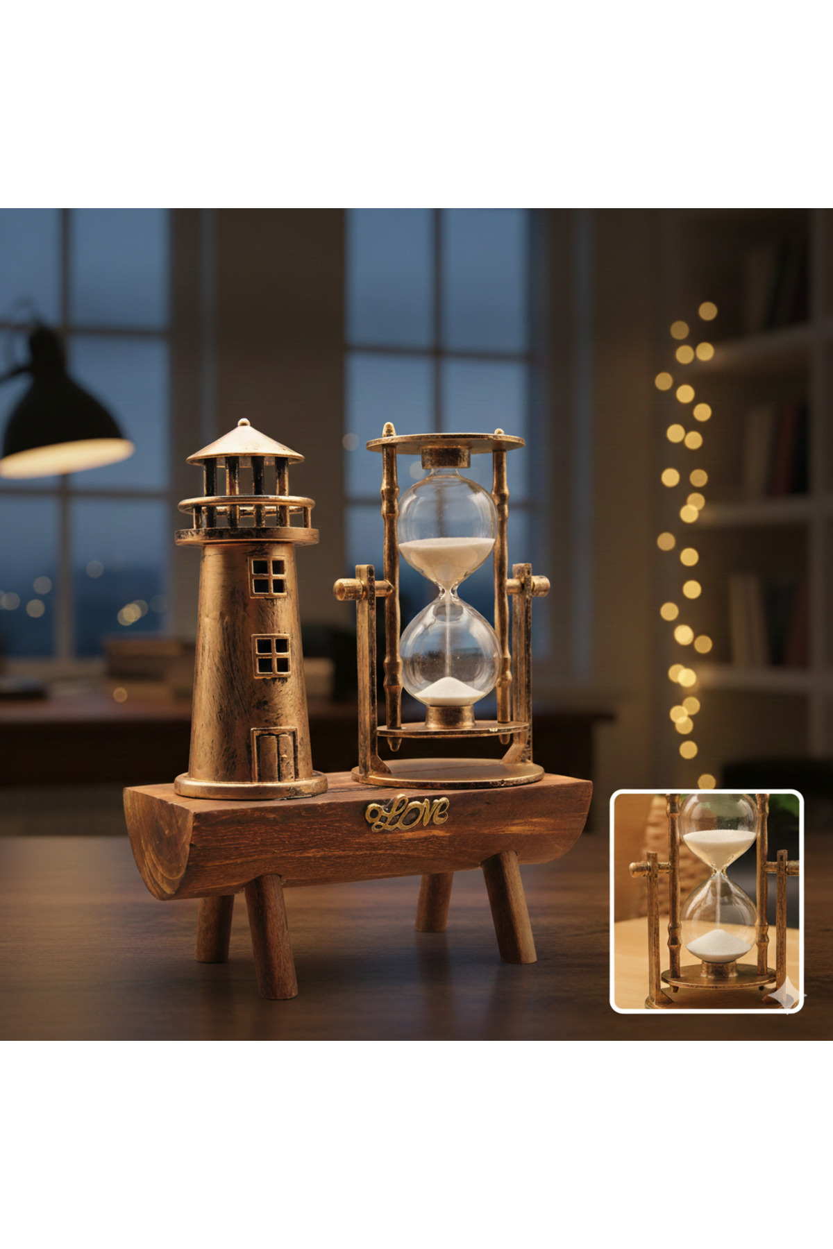 Deniz Feneri Biblolu Dekoratif Kum Saati – Retro Ahşap Standlı Masa Üstü Süs Eşyası
