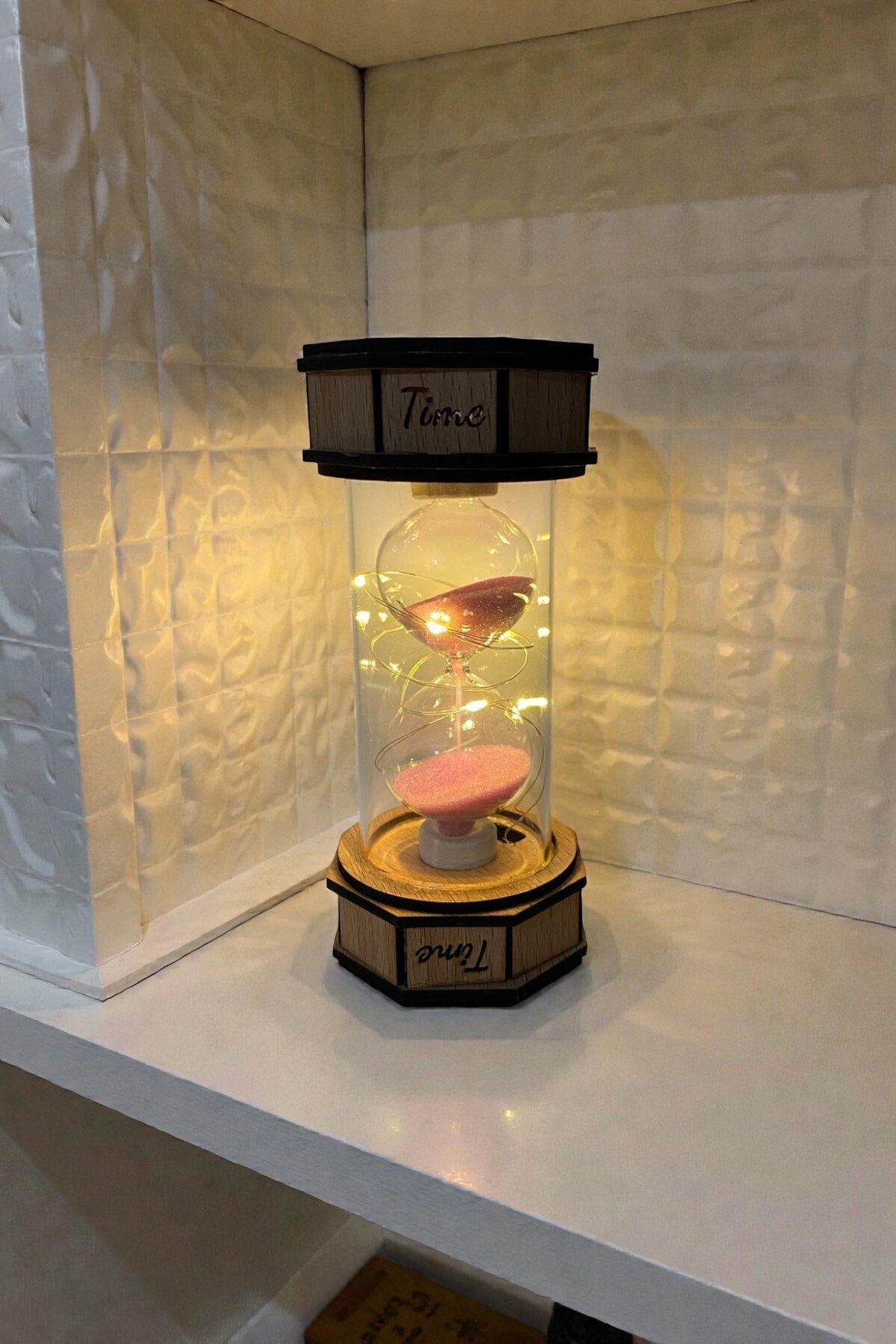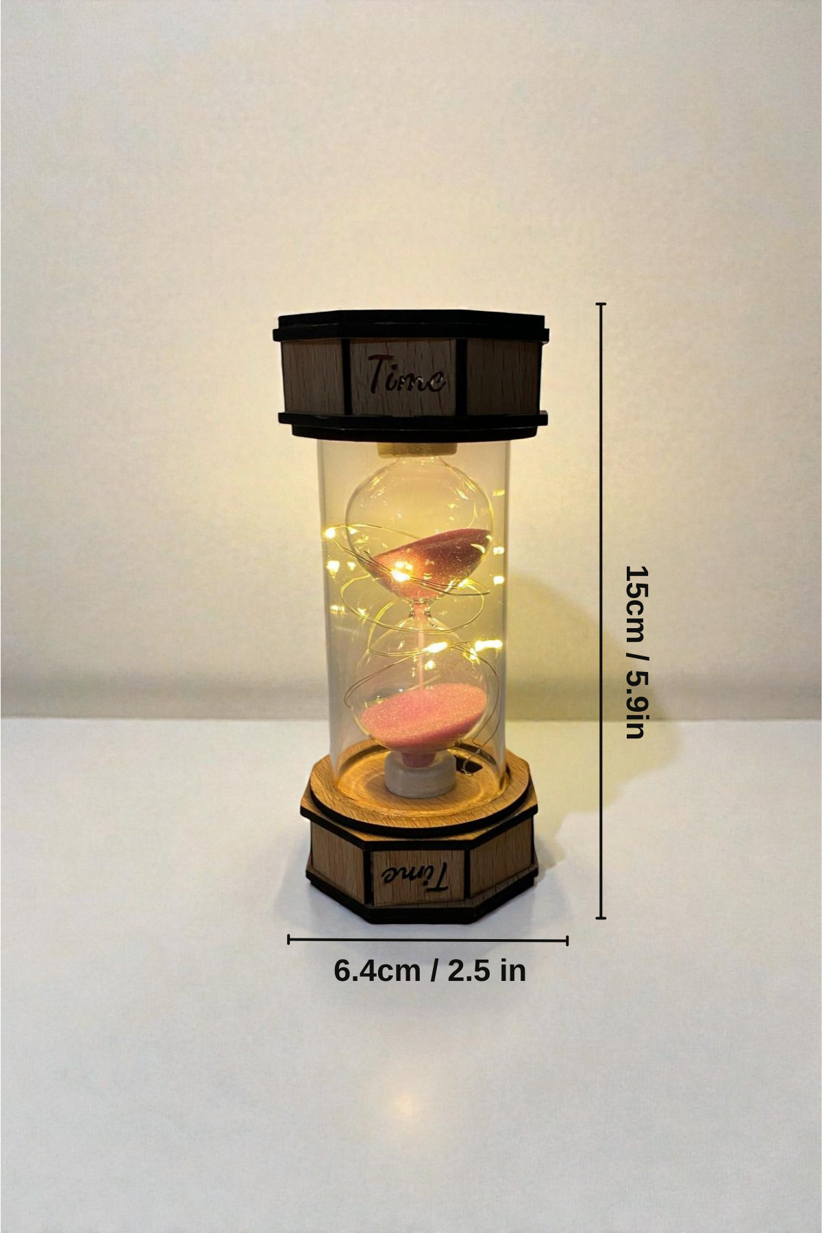 - Ahşap Işıklı Kum Saati, zarif tasarımıyla her ortama şıklık katar.