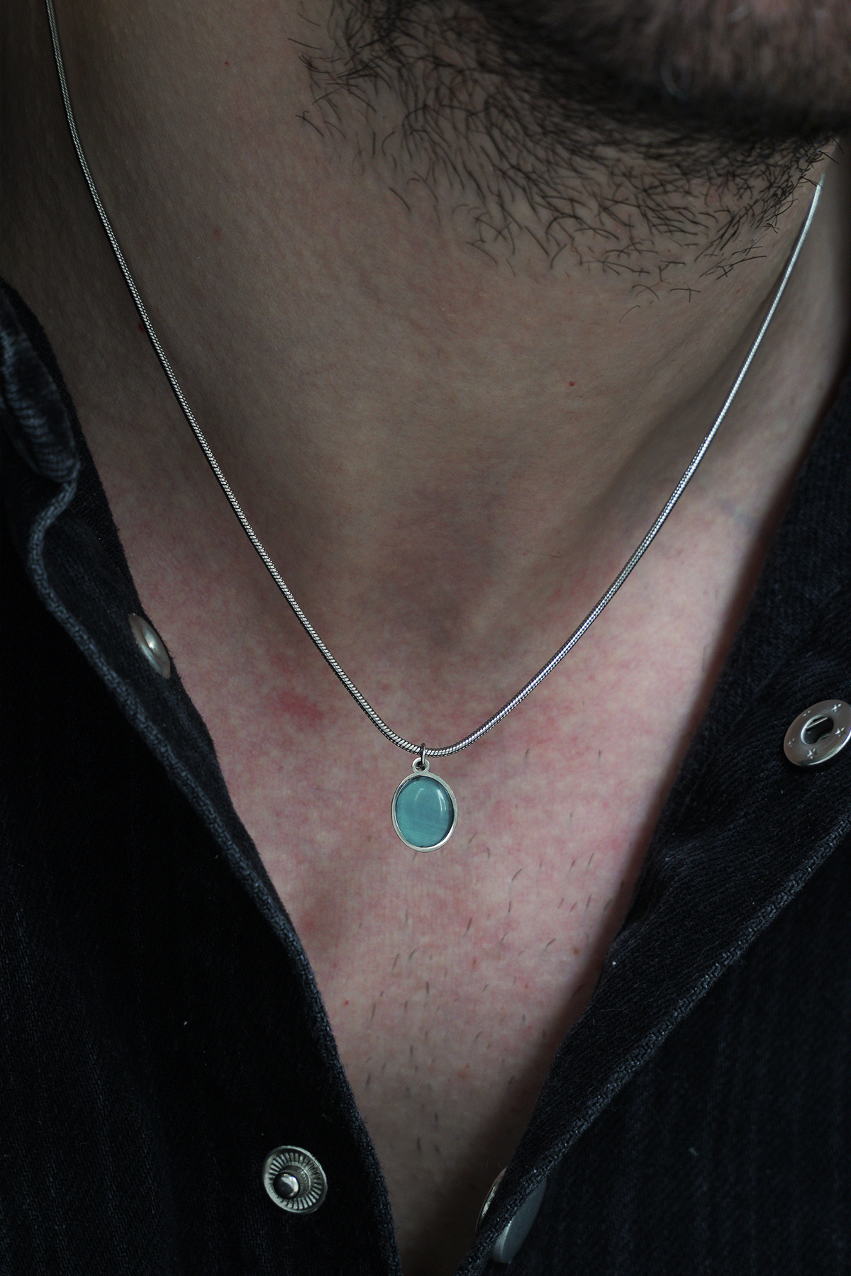 45 cm uzunluğundaki paslanmaz çelik snake zincir, oval formda Yeşil doğal taş kolye ucu ile birleşerek modern ve sade bir stil sunar.