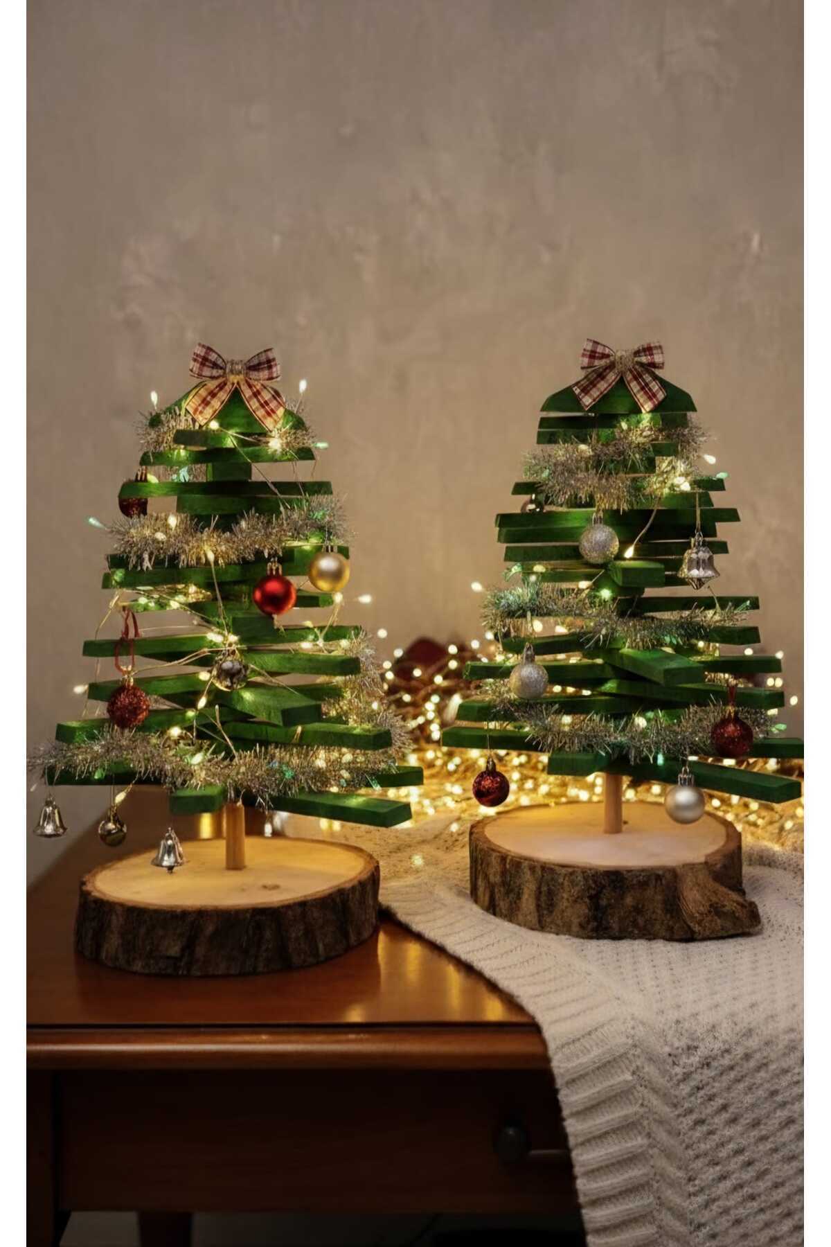 Bu dekoratif ahşap yeni yıl ağacı kiti, 22 cm boyundaki doğal ahşap ağacı, LED ışık zinciri ve çeşitlilik gösterebilen mini süsleriyle evinize sıcak ve modern bir yılbaşı atmosferi kazandırır.