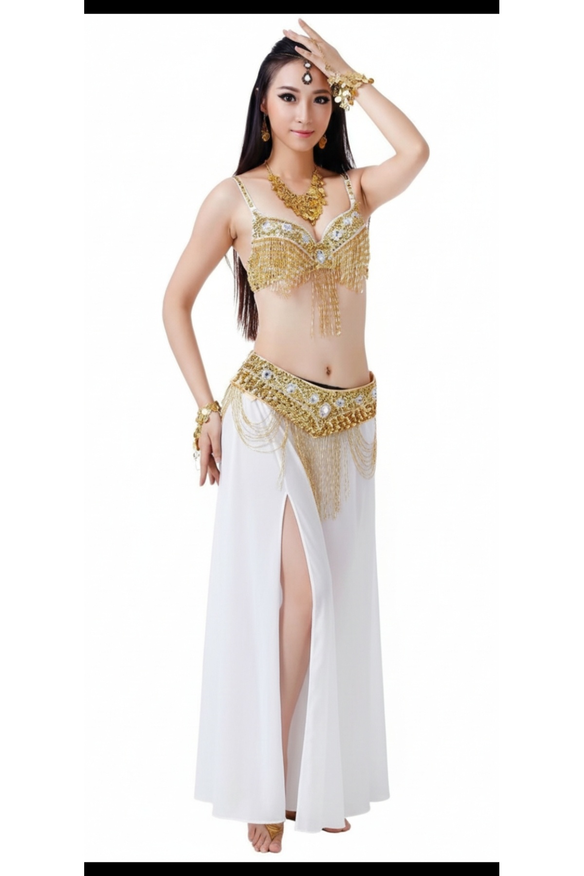 - Göz alıcı payet dokusuyla dikkat çeken Oryantal Dansöz kostümü, sütyen, kemeri, beyaz etek üç parça fayit sahne şıklığınızı tamamlar.