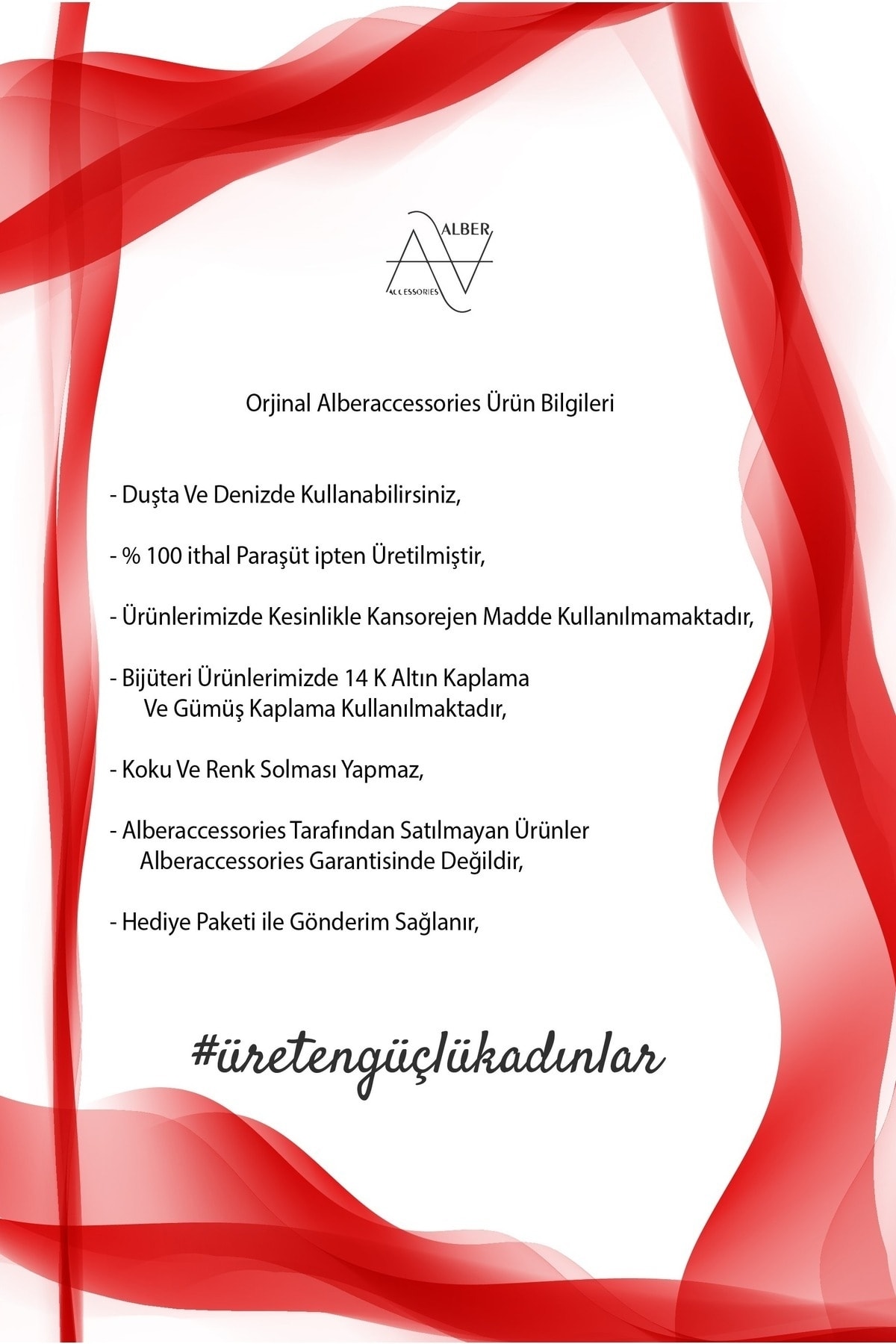 Alberaccessories'den Satın alınan Her ürün ve hizmetAlberaccessories Garantisi Altındadır! Tamamı Elde Üretilmiştir, Krem, Parfüm, Alkol, Çamaşır SuyuGibi Kimyasal Maddeler İle Temasından Kaçınılmalıdır, Ürün Bakımınızı PamukluYumuşak Kuru Bir Bez İle Yapabilirsiniz, Ürünlerimizde Kesinlikle KanserojenMadde Nikel, Boya vb madde Kullanılmamaktadır,