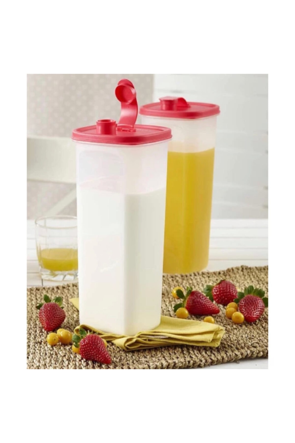 Kapağı kırmızı, gövdesi şeffaf. 2 litre hacmindedir. Su, süt, limonata, ayran, meyve suyu veya komposto için idealdir.