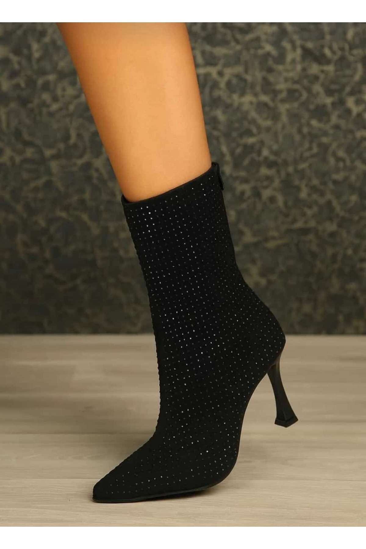 - Şık ve gece ortamları için ideal, taş detaylı siyah kadife yüksek topuklu bot çizme.