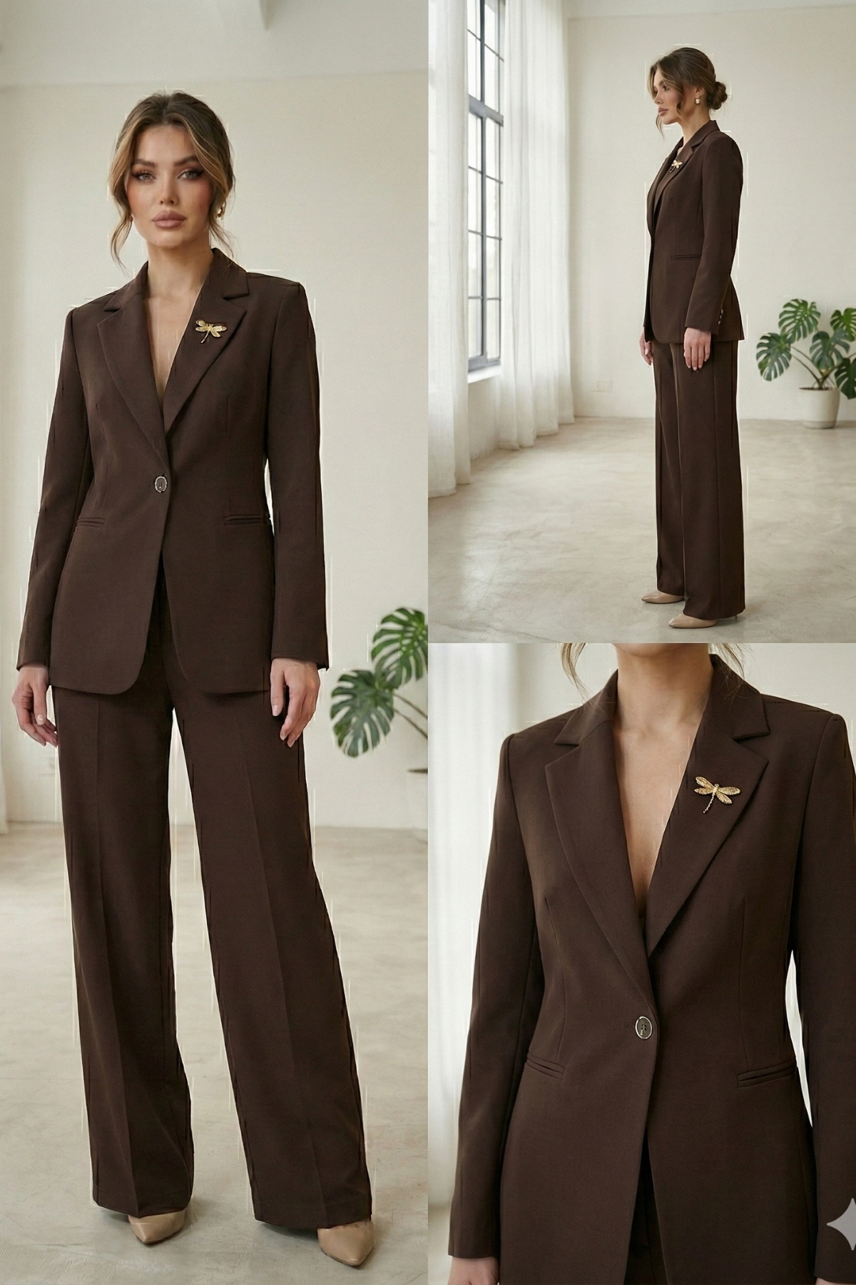 Zarif broş detayı ve Özgün Tasarımıyla midi boy blazer ceket, günlük şıklığınızı tamamlar.