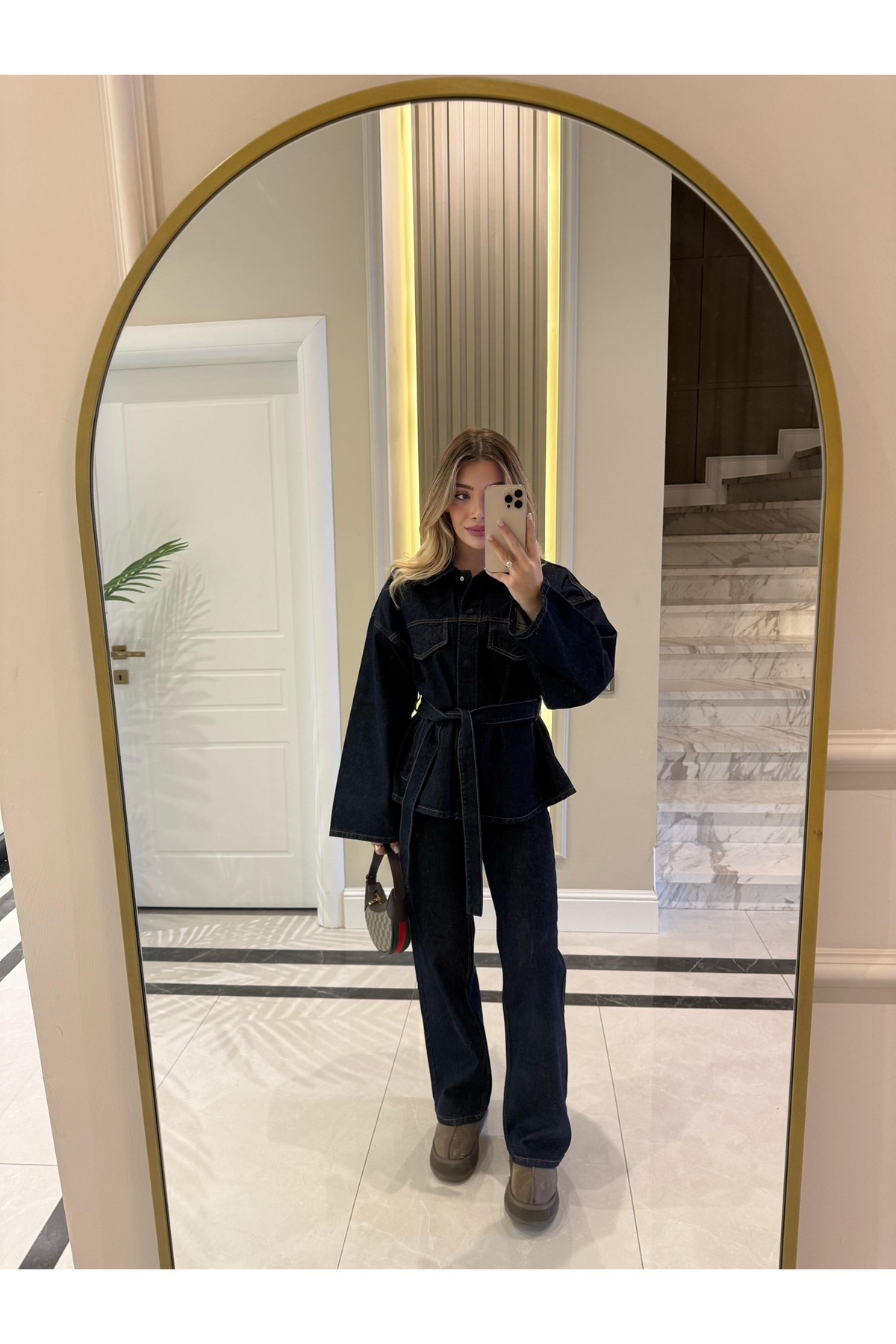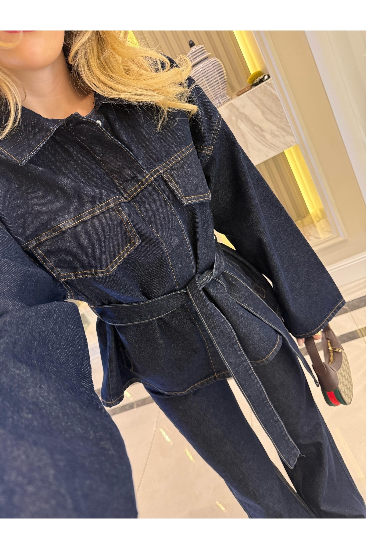 Kuru Temizleme Yapılmaz UZUN KOLLU, KATLI YAKALI, ÖNÜ GİZLİ ÇITÇIT DÜĞMELİ, YANLARI CEPLİ VE KEMERLİ GÖMLEK YÜKSEK BEL, ÖNÜ FERMUARLI VE METAL DÜĞMELİ 5 CEPLİ PANTOLON Model Kemerli Denim Ceket Pantolon Takımı Modern kesimi ve rahat kalıbıyla günlük şıklığın anahtar parçası.
