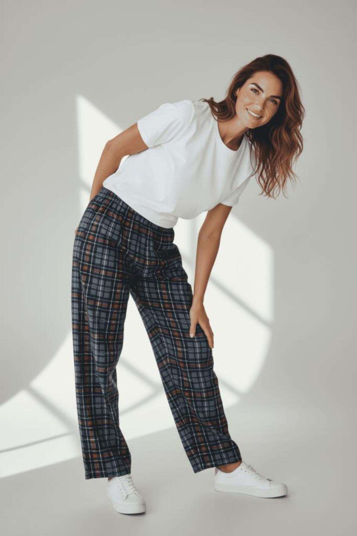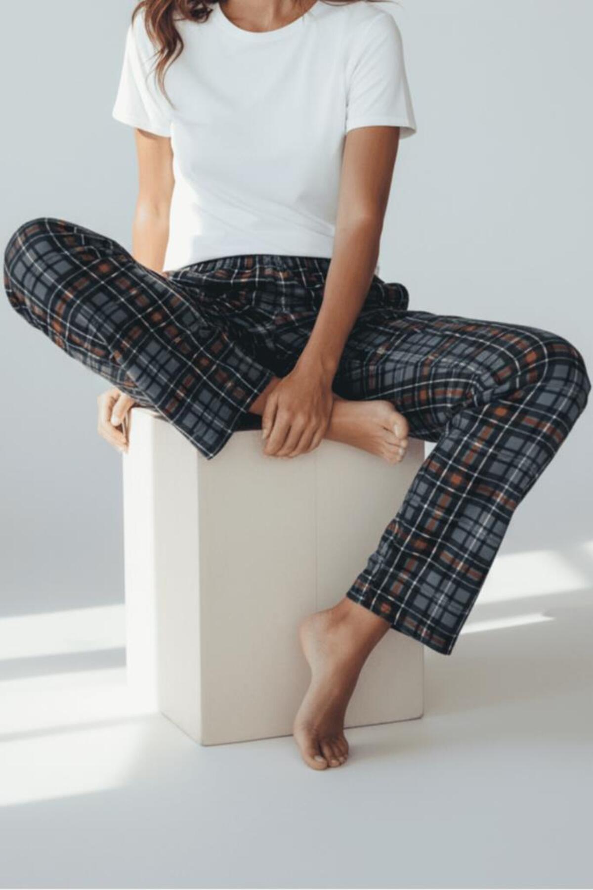 Kadın Kadife Pijama Altı Eşofman Pamuklu Antrasit Kare