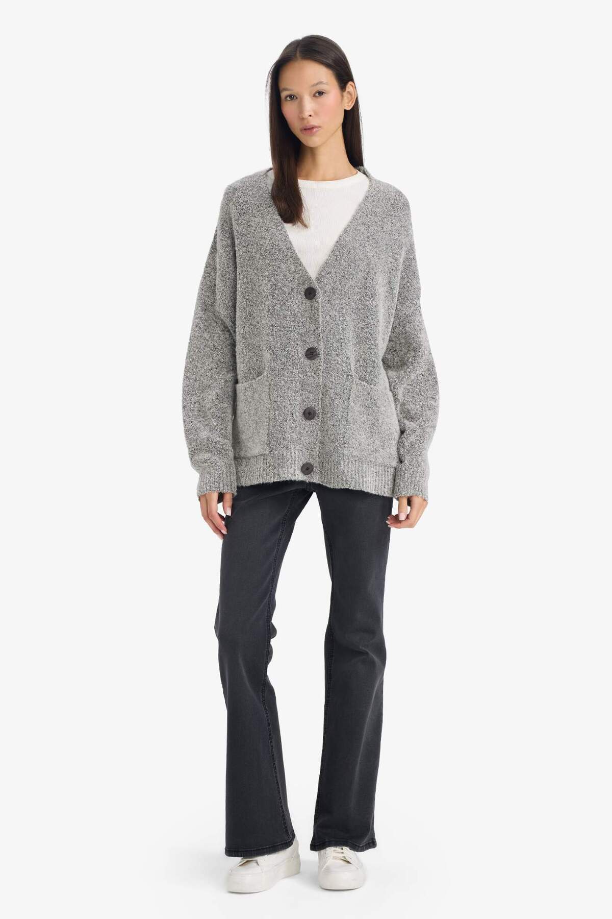 Oversize Geniş Kalıp V Yaka Hırka, rahat kesimi ve yumuşak dokusuyla sıcak ve modern bir stil sunar.