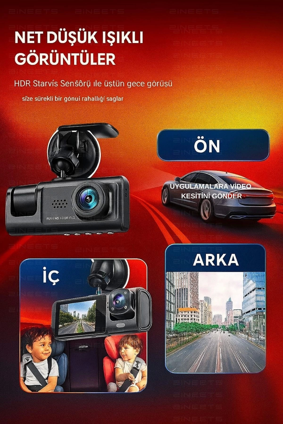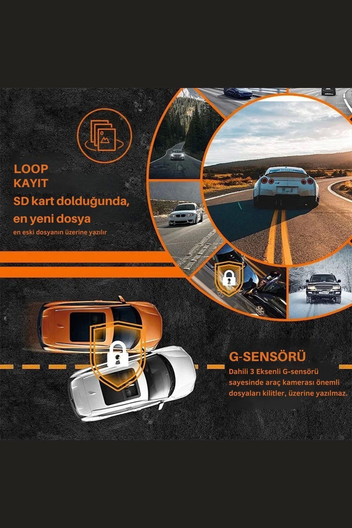 Wifi 1080p Araç içi 3 Kameralı Lcd Ekranlı Gece Görüşlü , G-sensör , Geri Görüş Kamera Üç Kameralı Araç İçi Kamera CC38 64GB Hafıza Kartlı