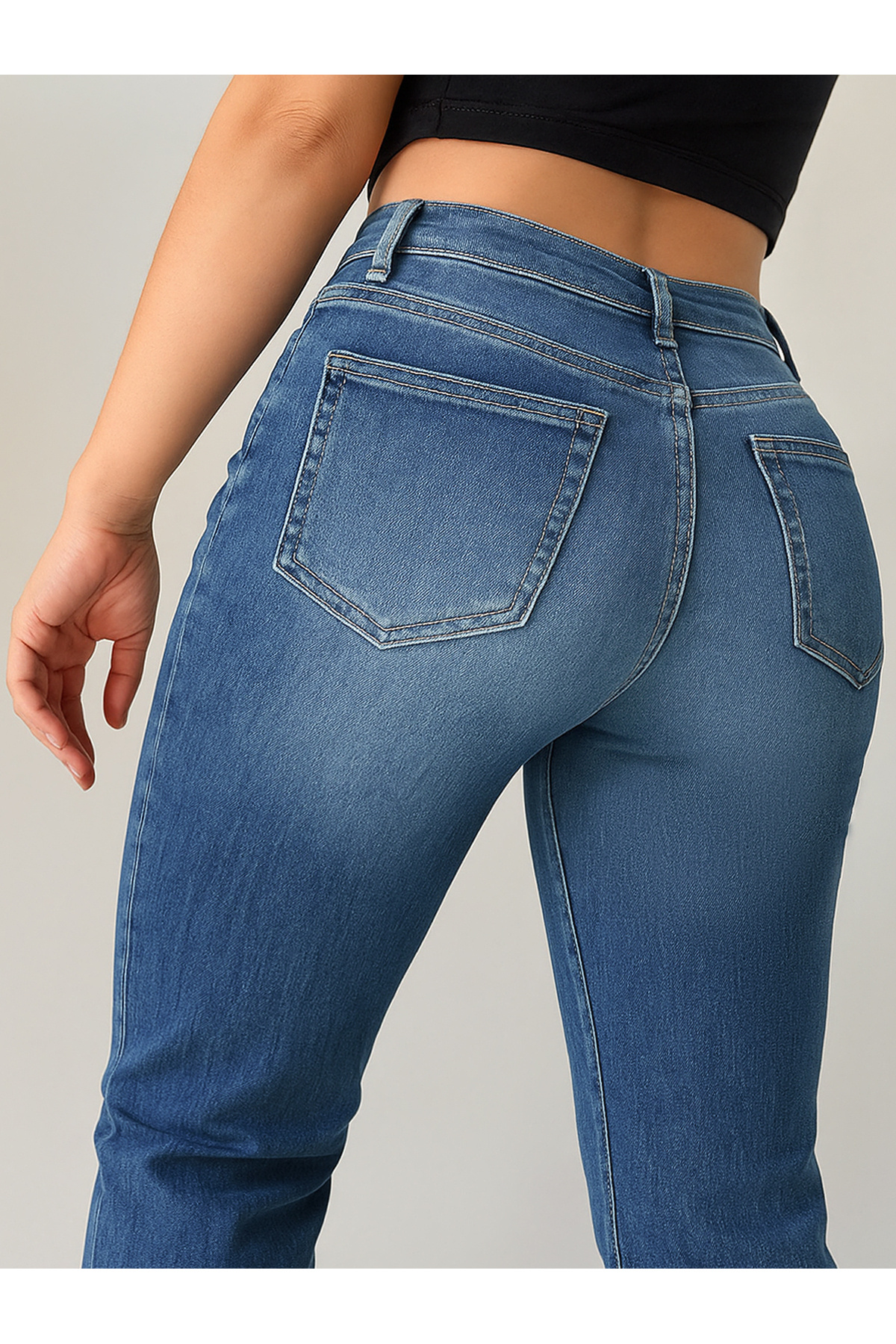 Kadın Mavi Yüksek Bel İspanyol Paça Likralı Kot Pantolon Günlük Ofis 4 Mevsim Jean