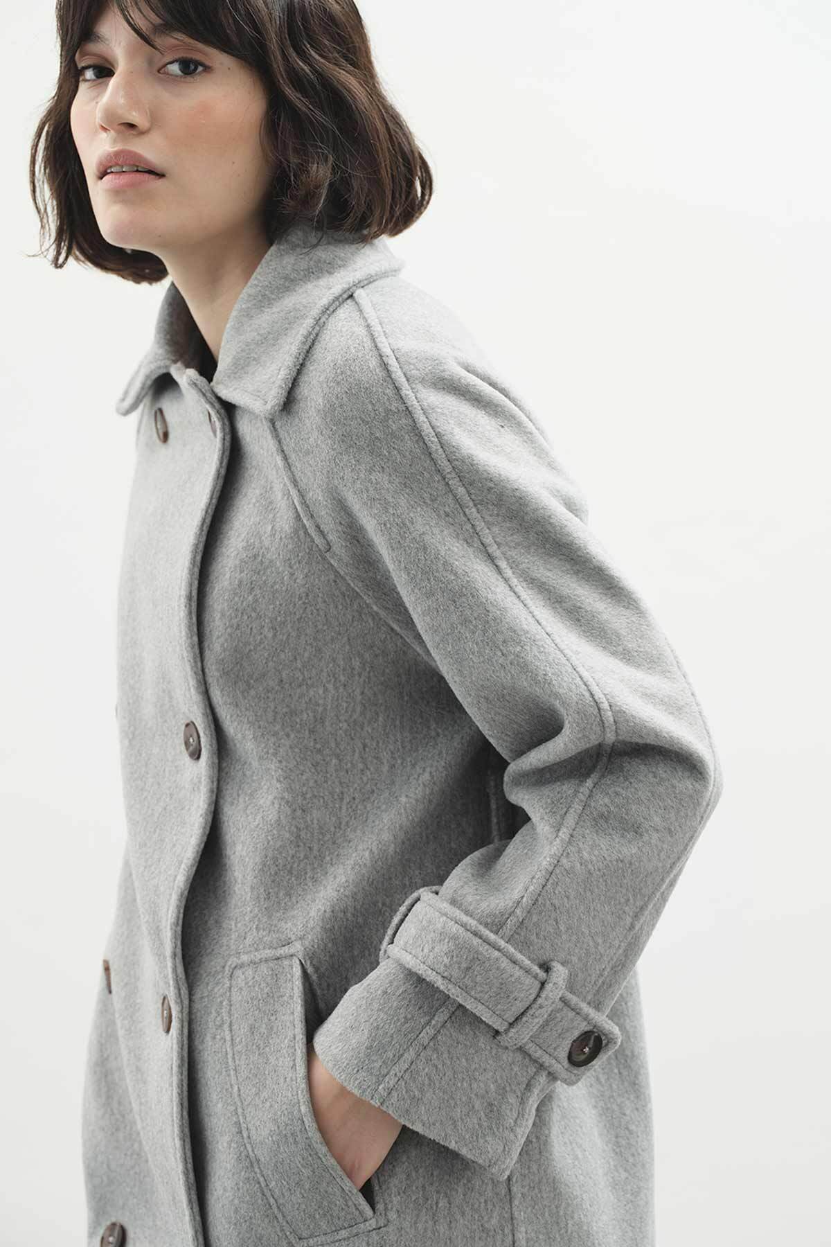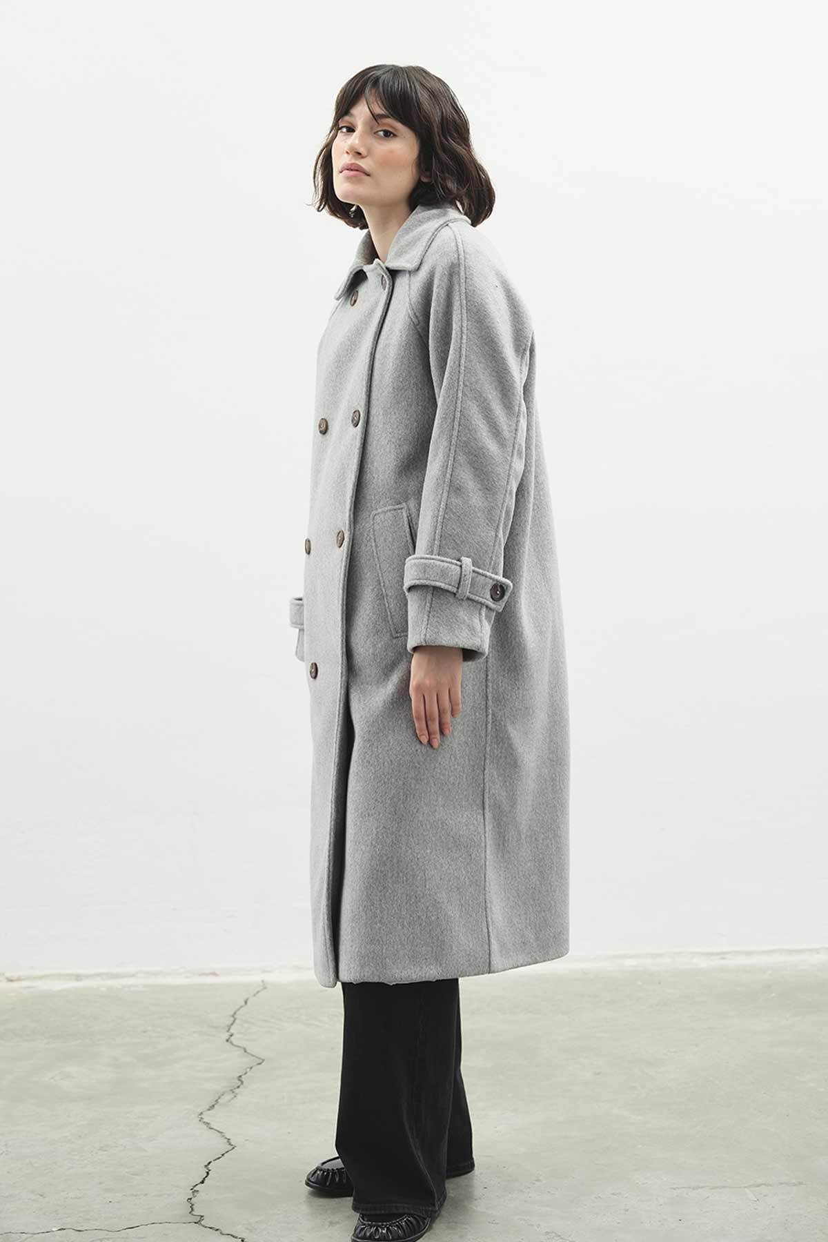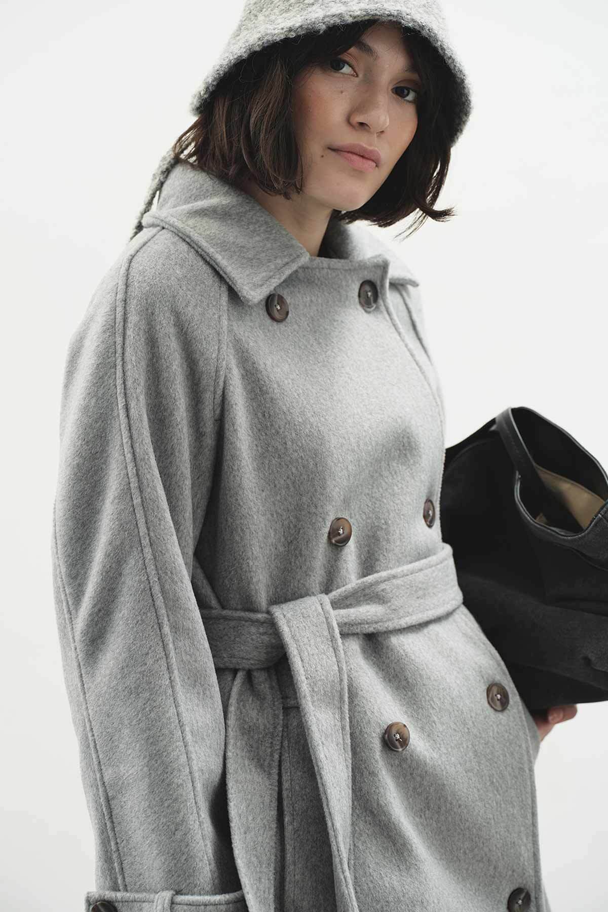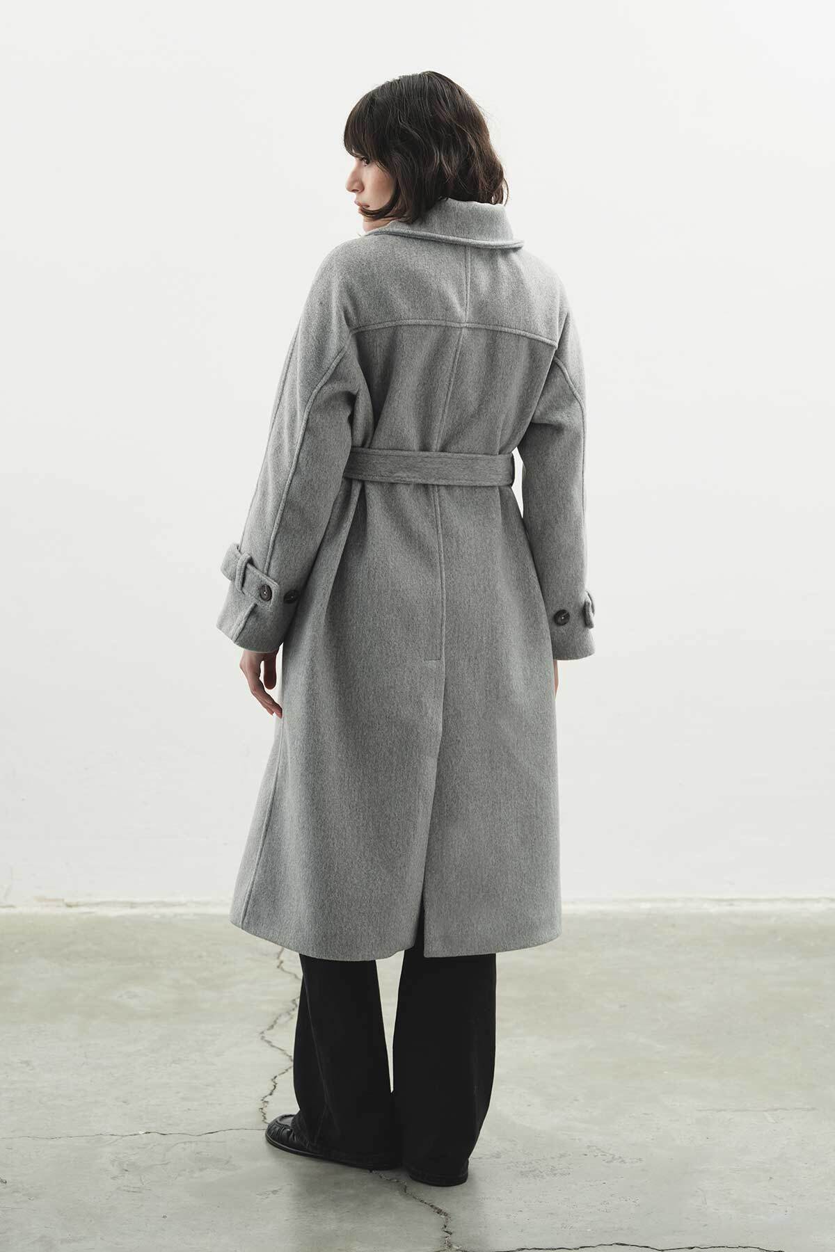 • Kruvaze yaka, önden düğme kapamalı, cepli, kendi kumaşından kuşaklı, kemer köprülü, arkadan yırtmaç detaylı, rahat kalıp, astarlı premium kruvaze kaşe kaban.