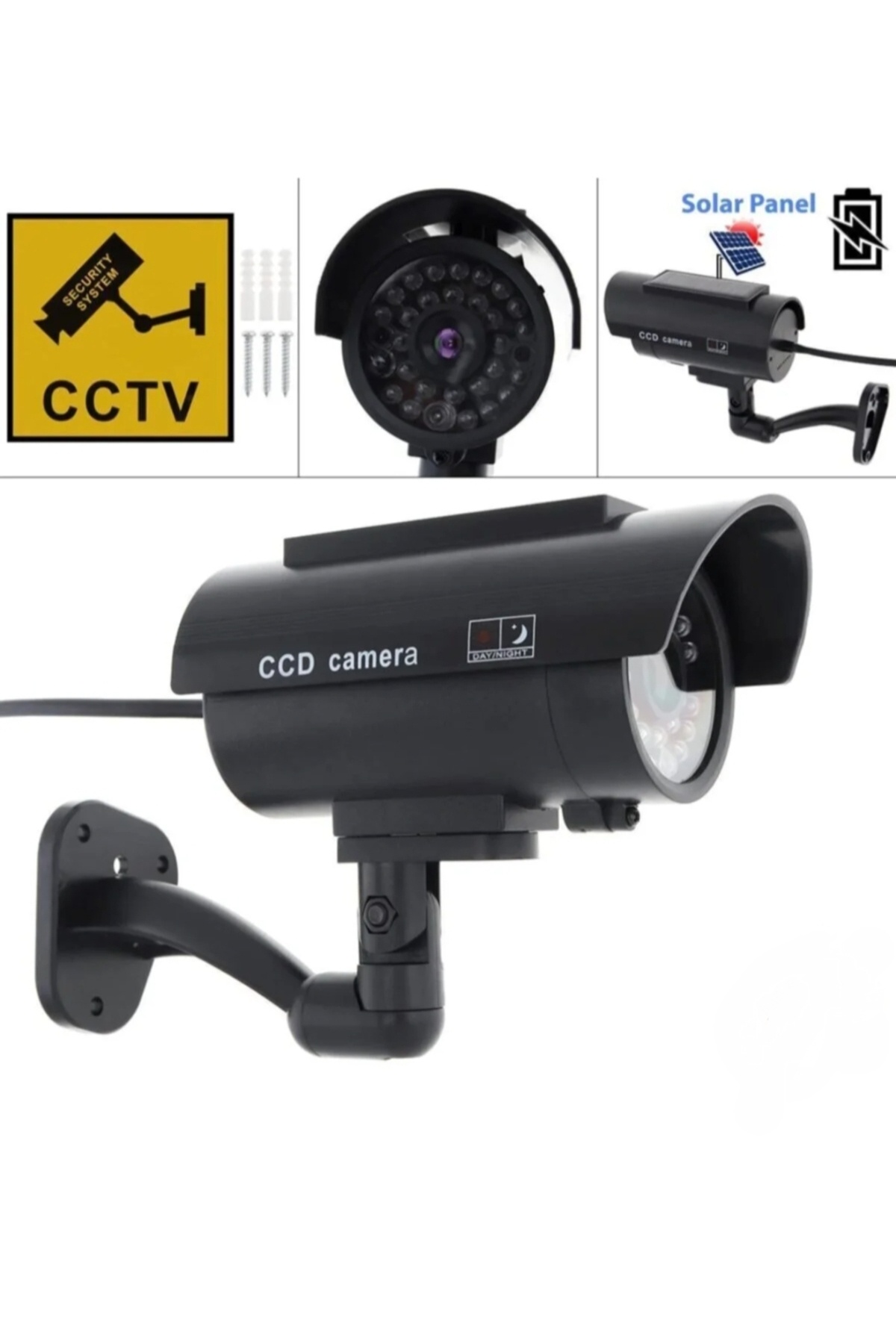 Caydırıcı güneş enerjili güvenlik kamerası görünümlü cihaz.