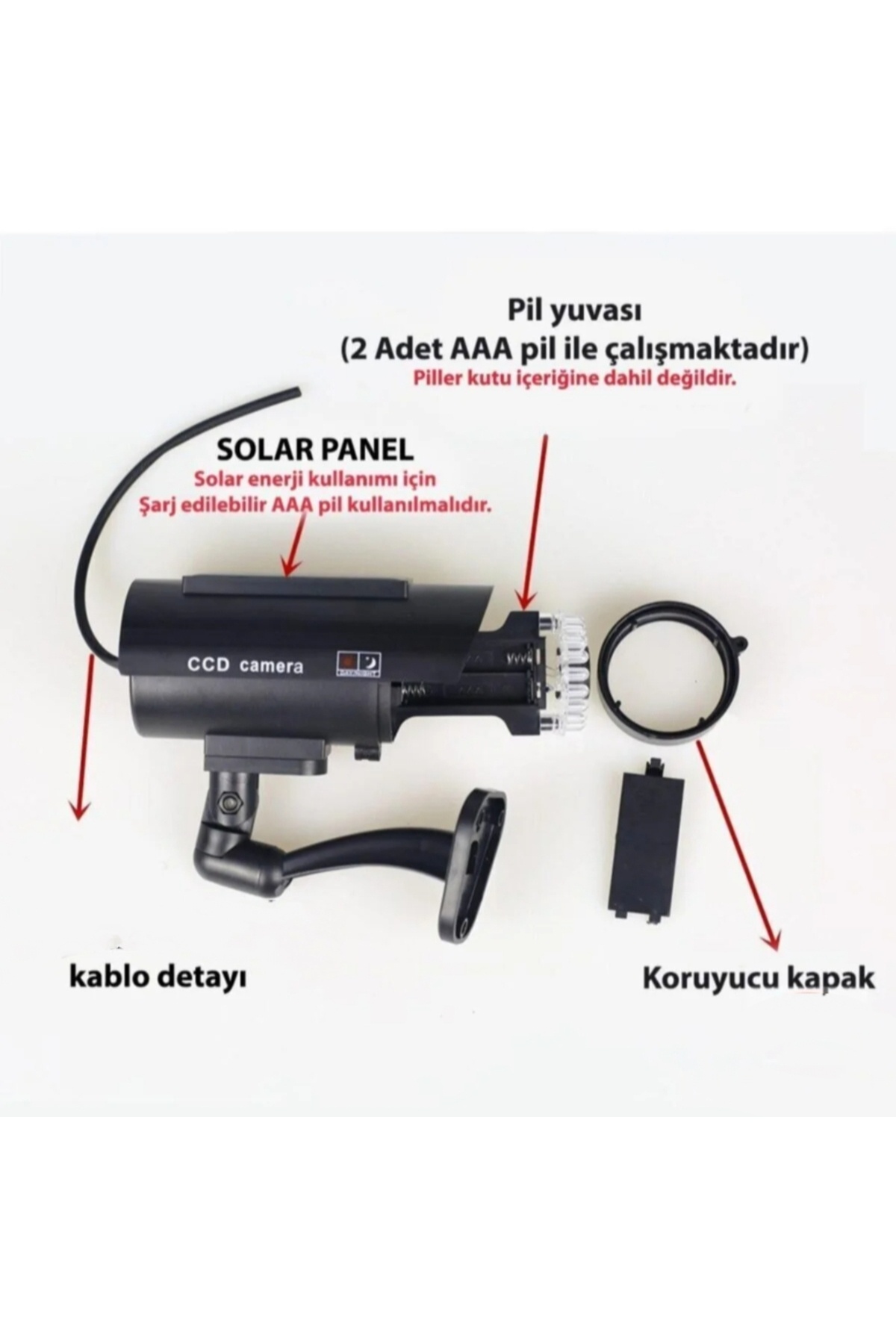 Güneş enerjili güvenlik kamerası görünümüyle yeteri kadar caydırıcı olacaktır Paket içeriği: 1 adet güneş enerjili kamera görünümlü cihaz 3 adet vida 1 adet güvenlik uyarısı sticker çıkartma