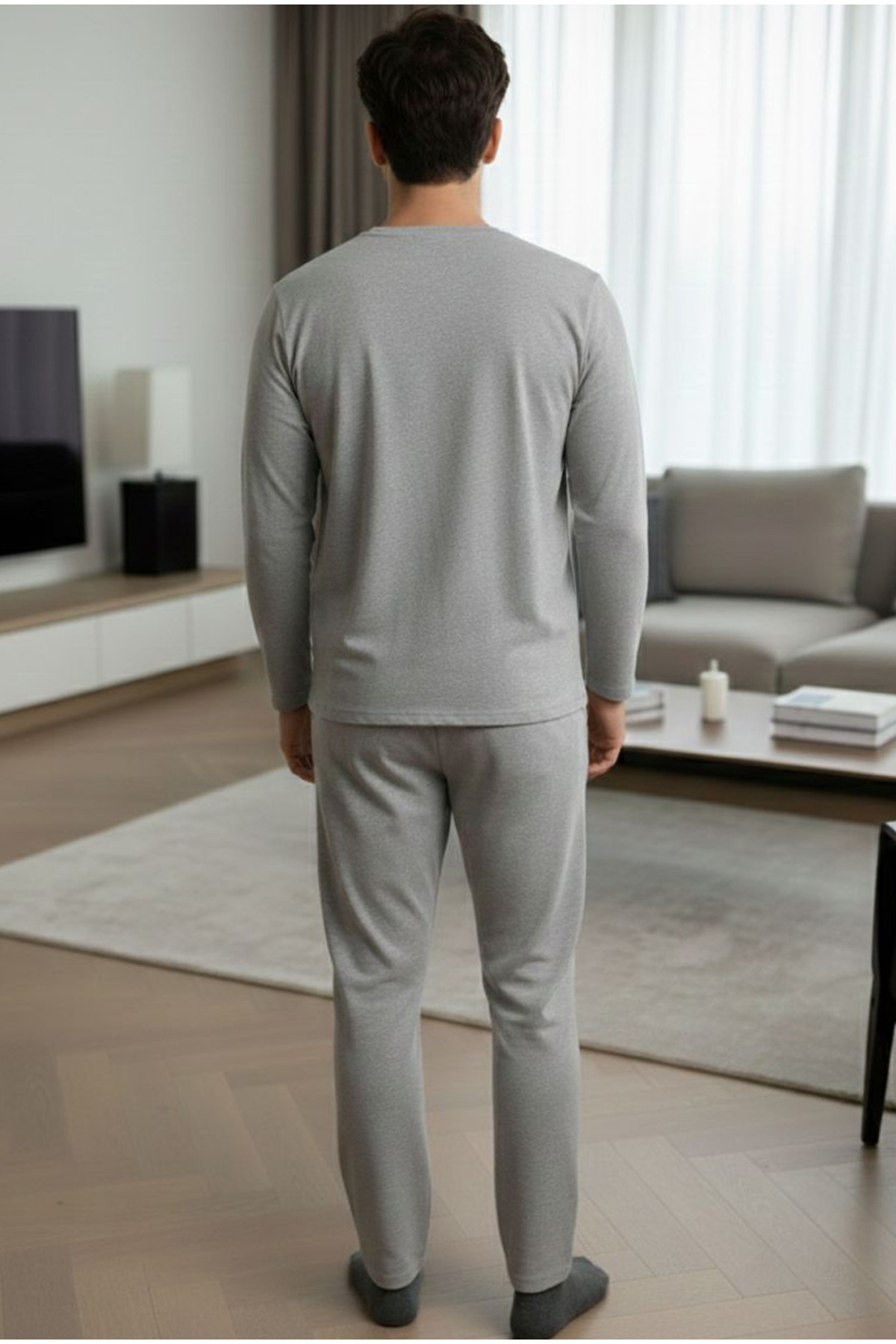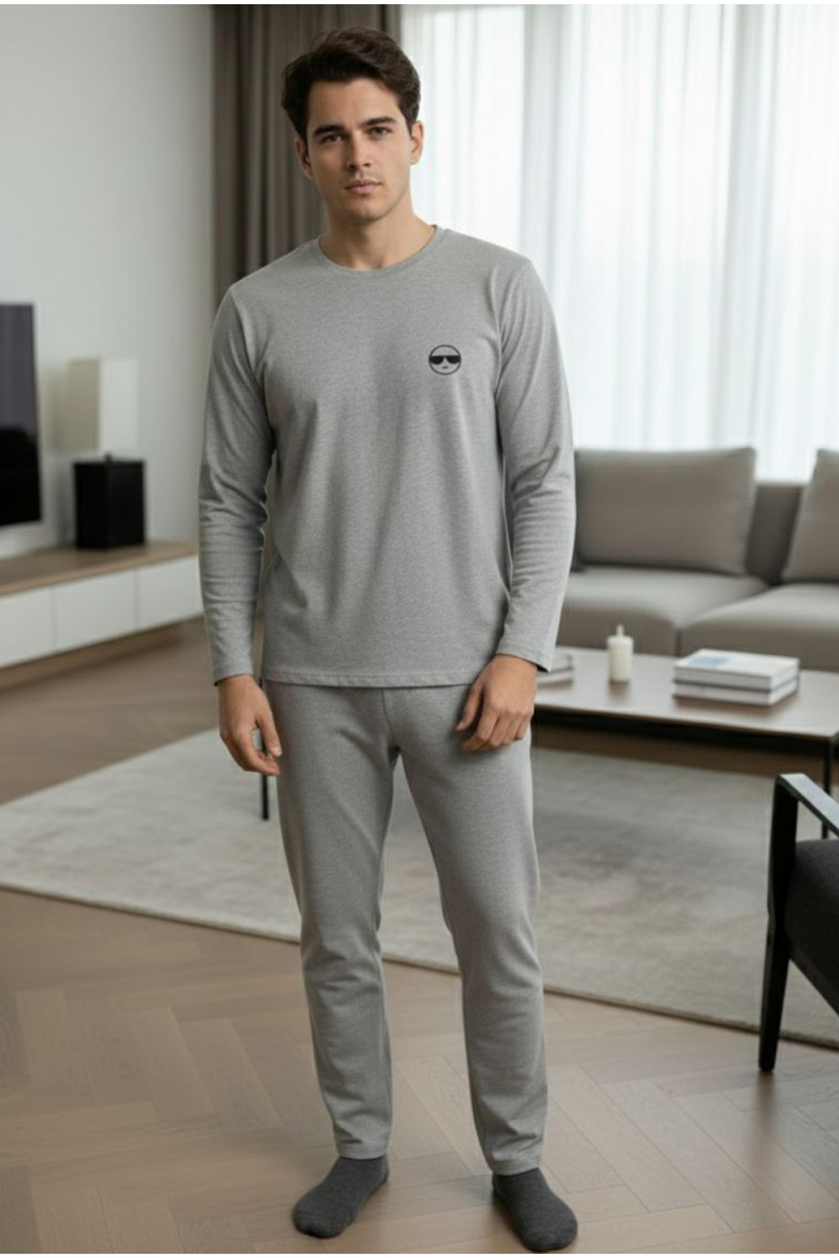 gri melanj Uzun Kollu Nakışlı Örme Erkek Pijama Takım7795