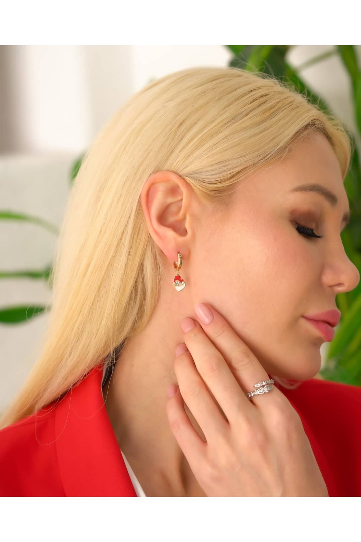 8 Ayar Altın Taş Detaylı Kırmızı Beyaz Kalpli Halka Küpe