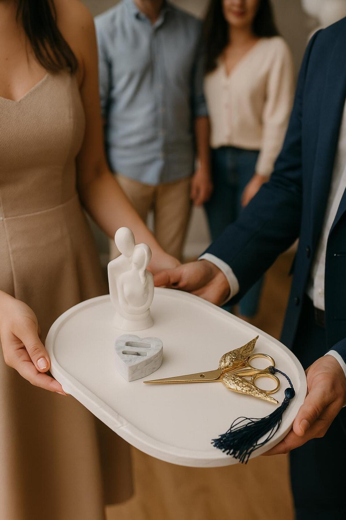 ) ⸻ ✔️ Öne Çıkan Özellikler • Taş tozu el yapımı özel tepsi • Yüzüklük • Minimal ve zarif çift biblo • Nişan–söz töreni için ideal • Fotoğraflarda çok estetik görünür • Özel günler için anlamlı ve şık bir set