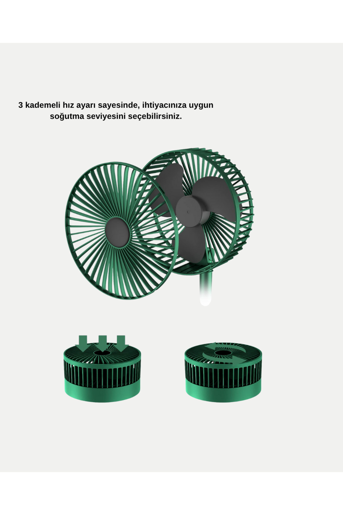 Kompakt boyutu, güçlü performansı, 3 kademeli hız ayarı ve şarjlı yapısıyla bu mini fan