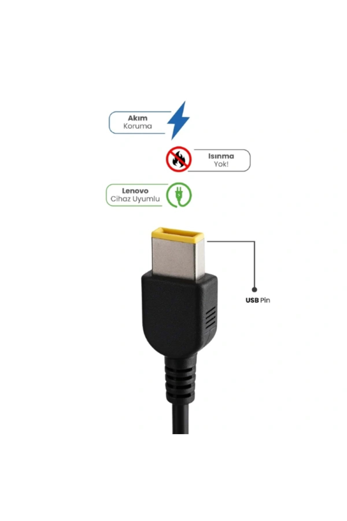 1.5 metre power kablosu kullanım kolaylığı sunarken, USB Pin ucu Lenovo modelleri ile tam uyumluluk sağlar.