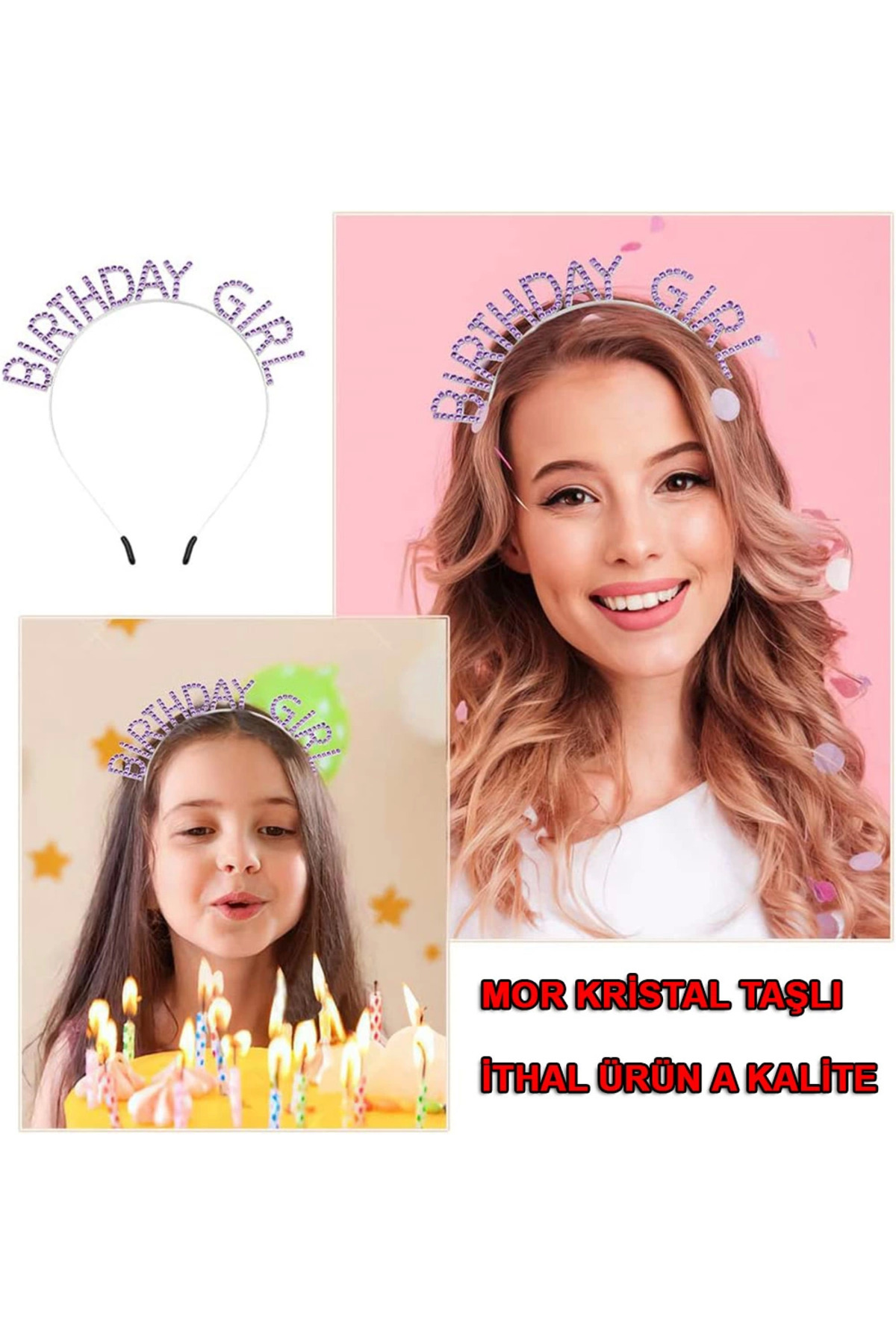 Mor Renk Kristal Taşlı Parlak Birthday Girl Yazılı Taç 16x17 cm