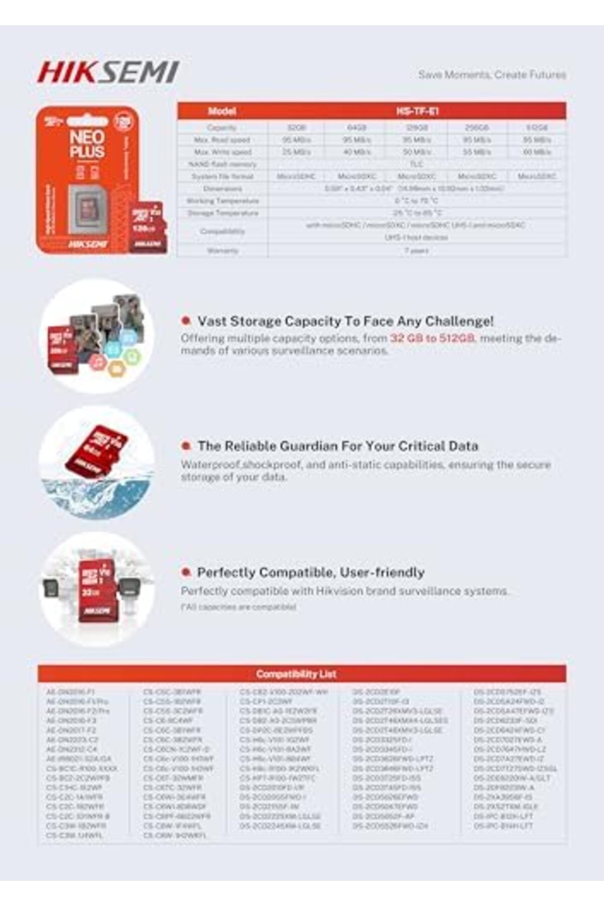 microSDXC 512 GB Kapasite 10 TLC 95 MB/sn'ye kadar okuma hızı, 60 MB/sn'ye kadar yazma hızı, V30 Yedi yıl garanti HS-TF-E1 512 GB Micro SD HS-TF-E1 512 GB Micro SD