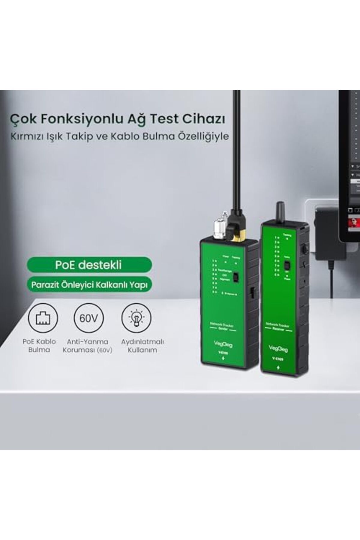 Model Kodu: V-E109 Fonksiyon: 2’si 1 arada ağ kablosu izleyici ve test cihazı Güç Kaynağı: Type-C şarj portu PoE Koruması: 60V anti-yanma özelliği Parazit Koruması: Kalkanlı, parazit önleyici yapı Malzeme: Dayanıklı ABS Test Modları & Fonksiyonlar Glitter / Hizalama Testi Switch Portu Bulma (Switch find wire) Fiber Optik Kırmızı Işık Testi PoE Kablo Bulma Kullanım Alanları Ağ kurulumu ve bakımı Kablo arızası tespiti ve sorun giderme PoE ağ testi Fiber optik kablo testi (kırmızı ışık ile) Profesyonel ve ev tipi ağ uygulamaları V-E109 Çok Fonksiyonlu Poe Destekli Fiber Optik Ağ Test Cihazı V-E109 Çok Fonksiyonlu Poe Destekli Fiber Optik Ağ Test Cihazı