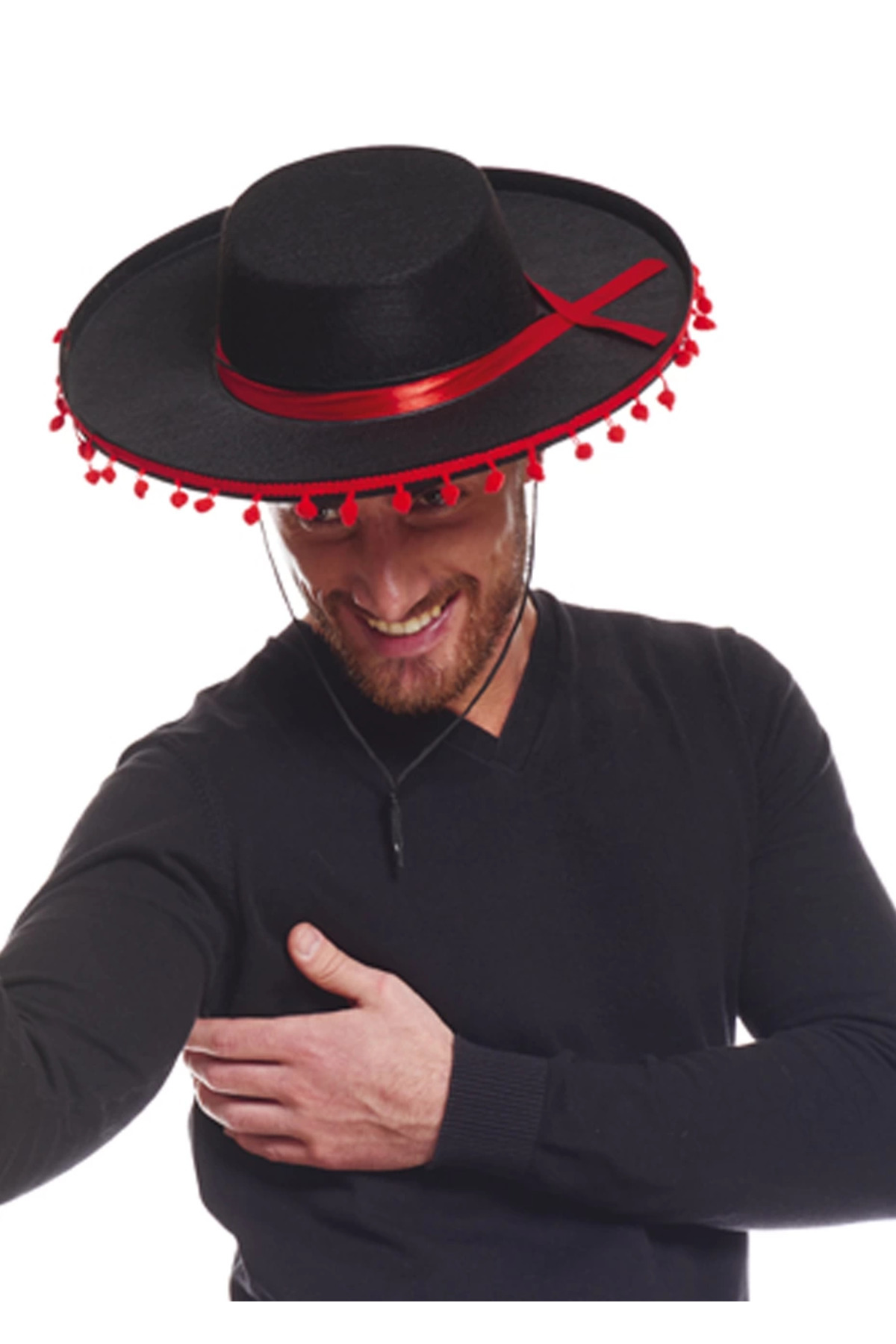 Kırmızı Ponponlu Siyah Renk Yetişkin İspanyol Şapkası