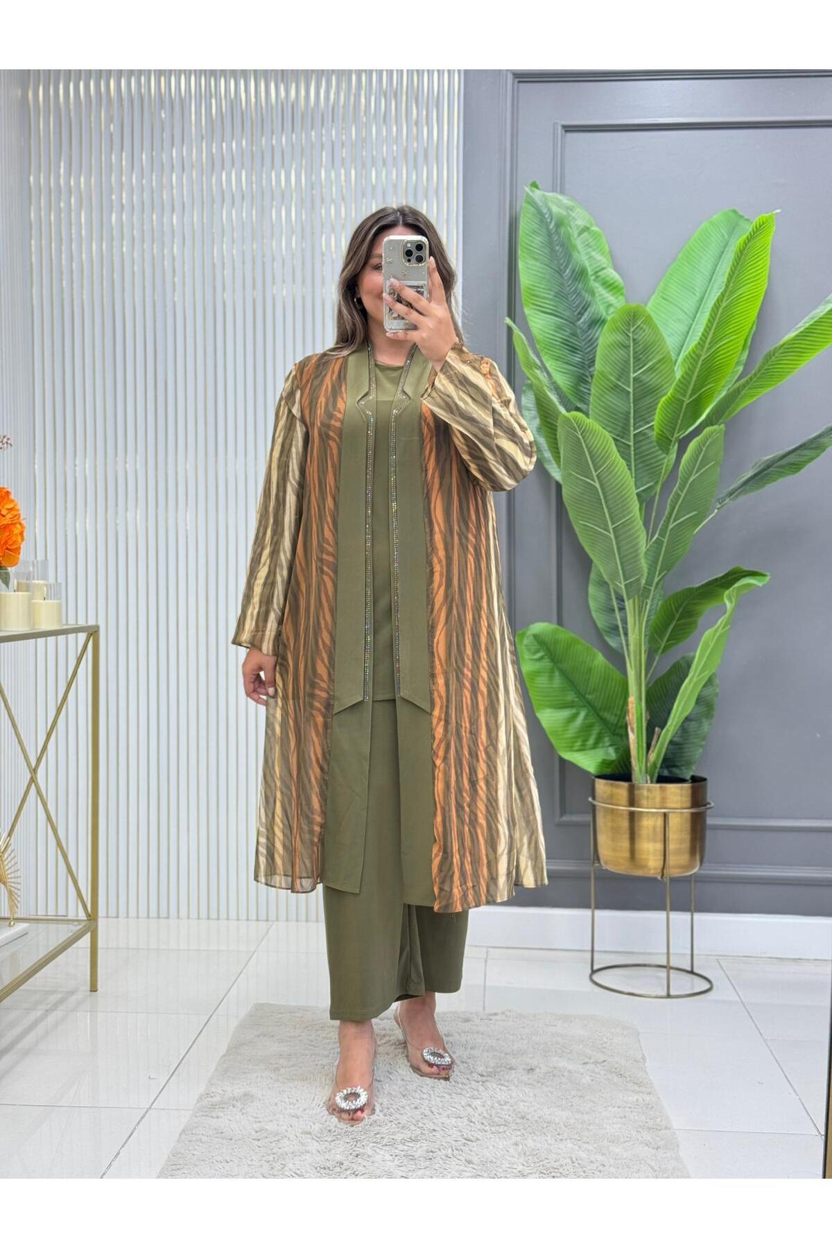 BÜYÜK BEDEN ÜÇLÜ ÇİZGİ DESENLİ TAKIM