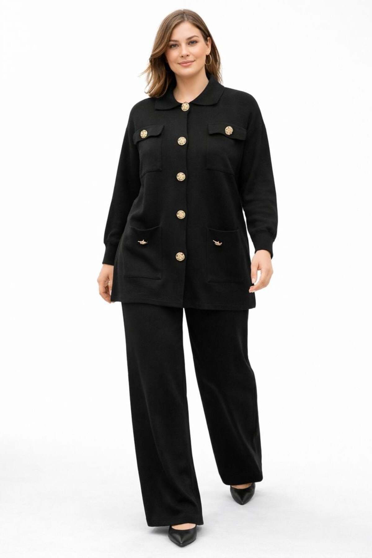 • Büyük Beden Düğmeli İkili Triko Takım Siyah