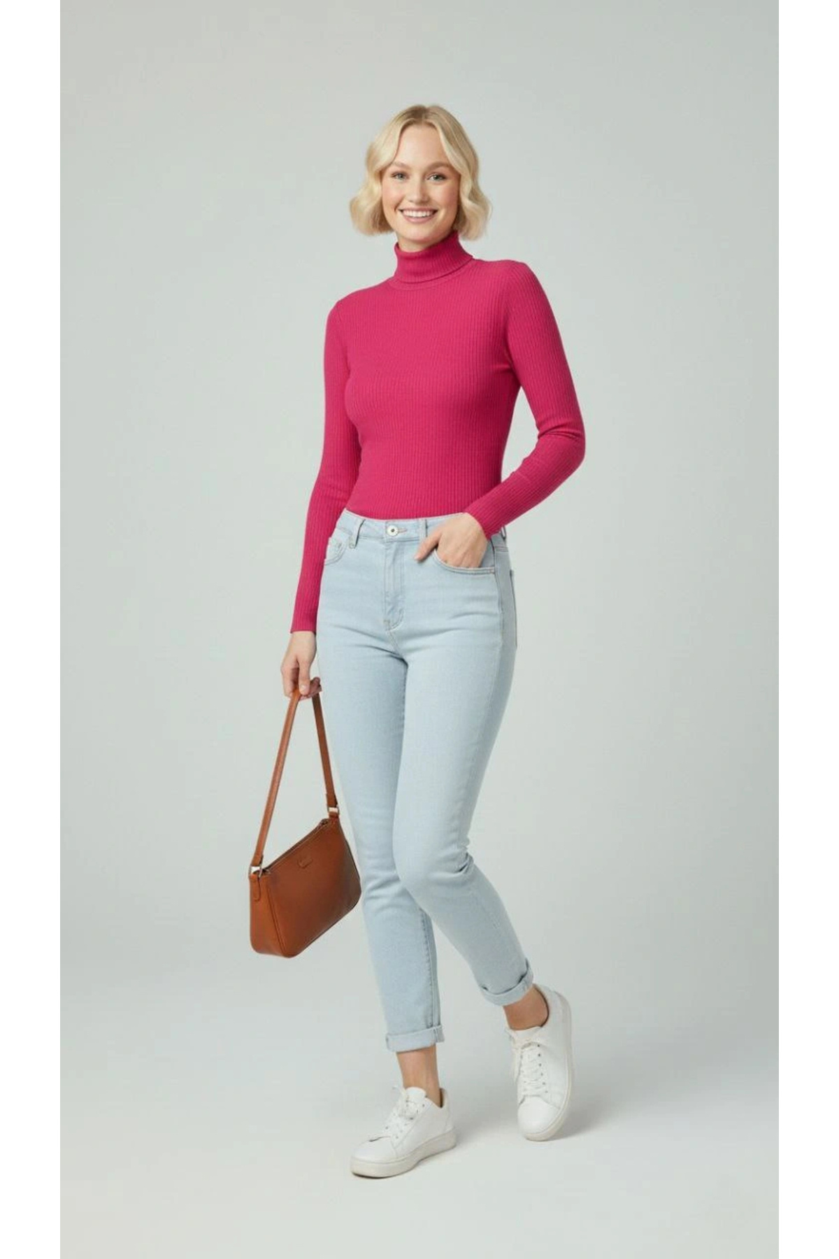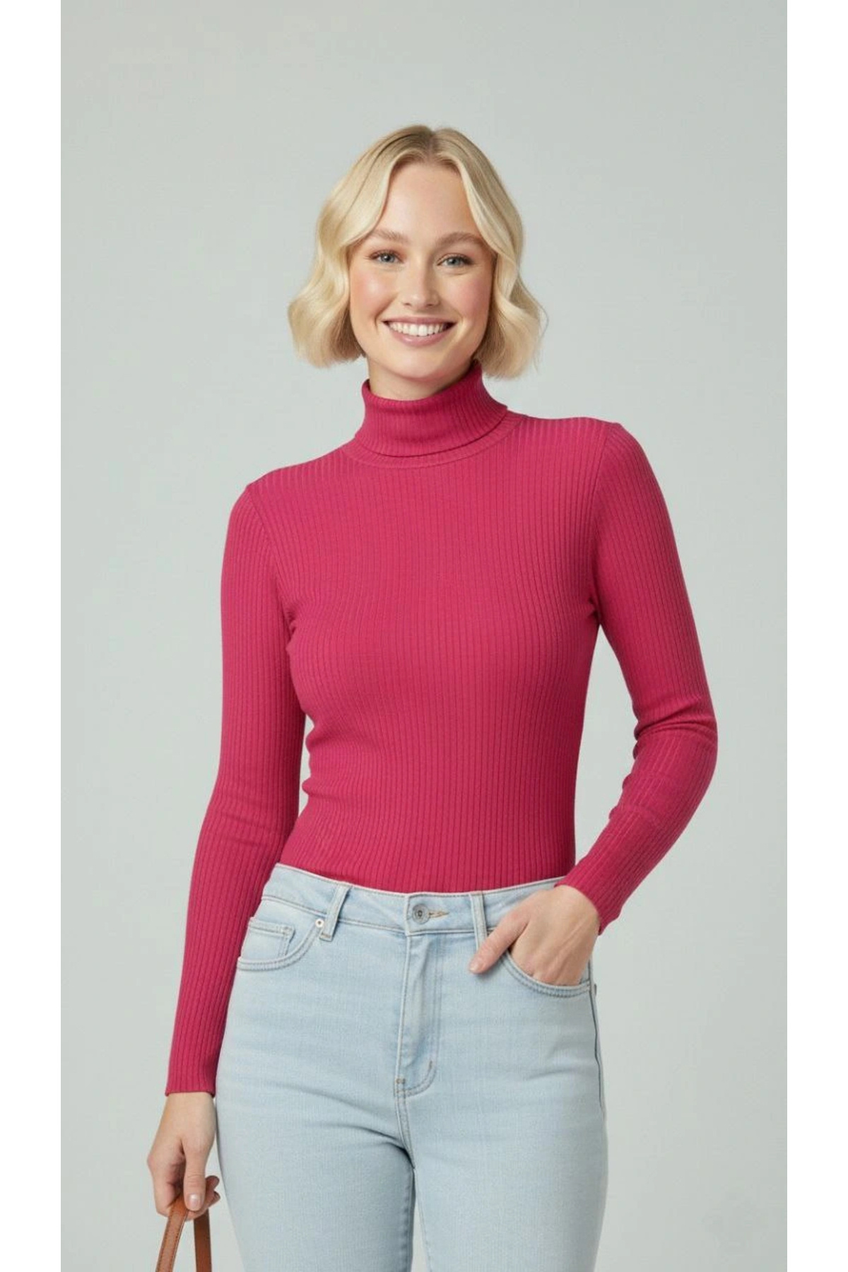 Kadın Tam Boğazlı Fitilli Likrali Kaşkorse Badi İnce Uzun Kollu Kazak - Pembe