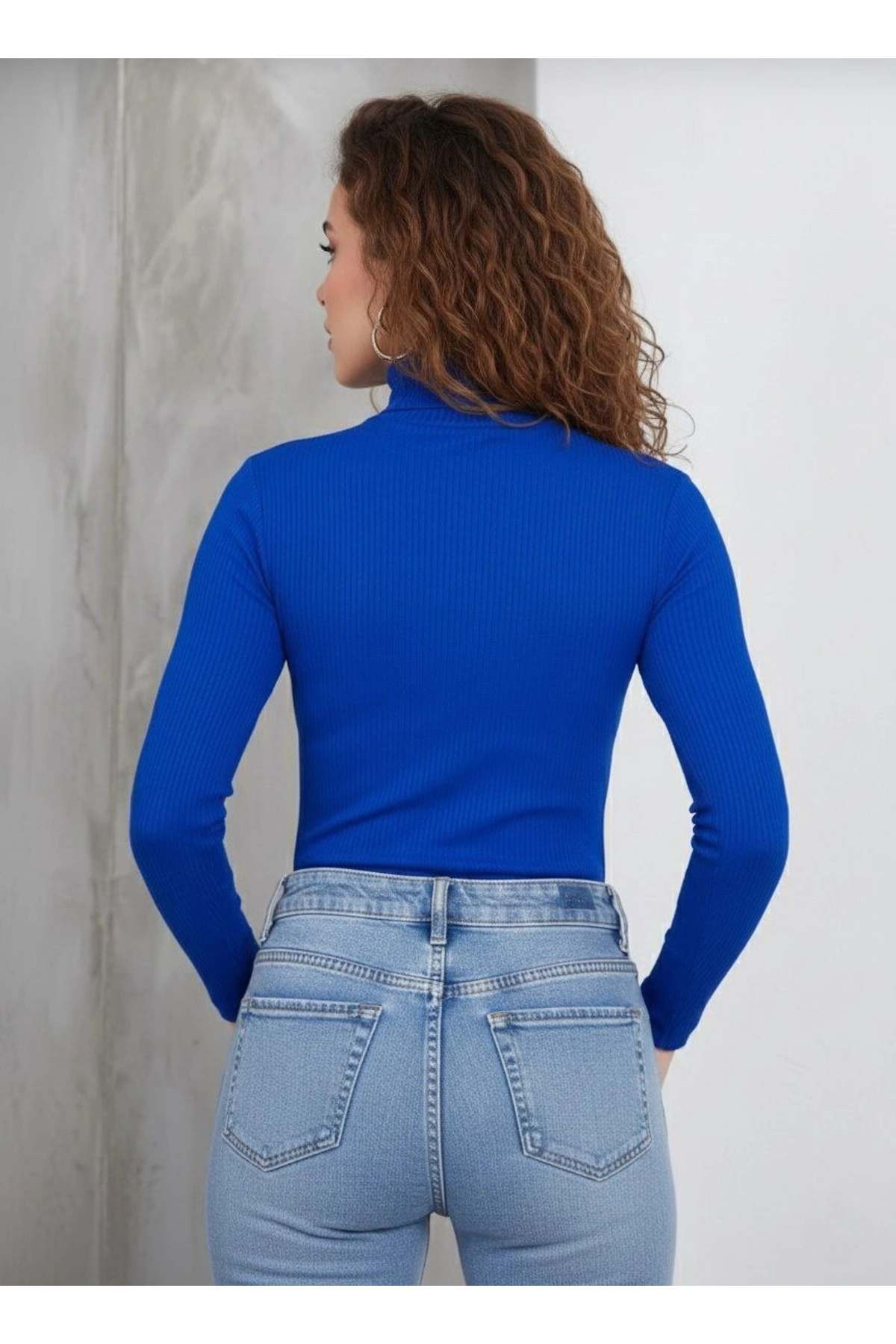 Kadın Tam Boğazlı Fitilli Likrali Kaşkorse Badi İnce Uzun Kollu Kazak - Saks Mavisi