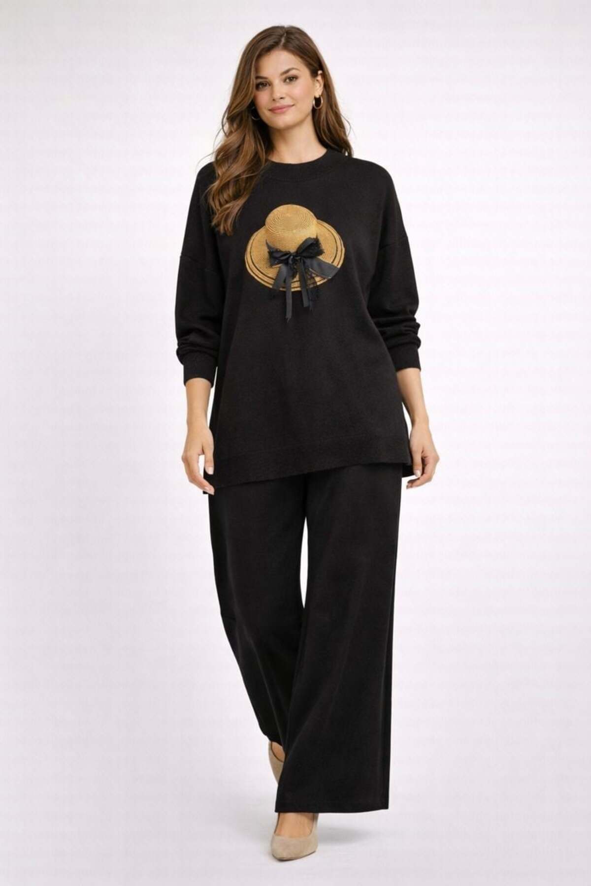 • Büyük Beden Önü Baskılı İkili Triko Takım Siyah