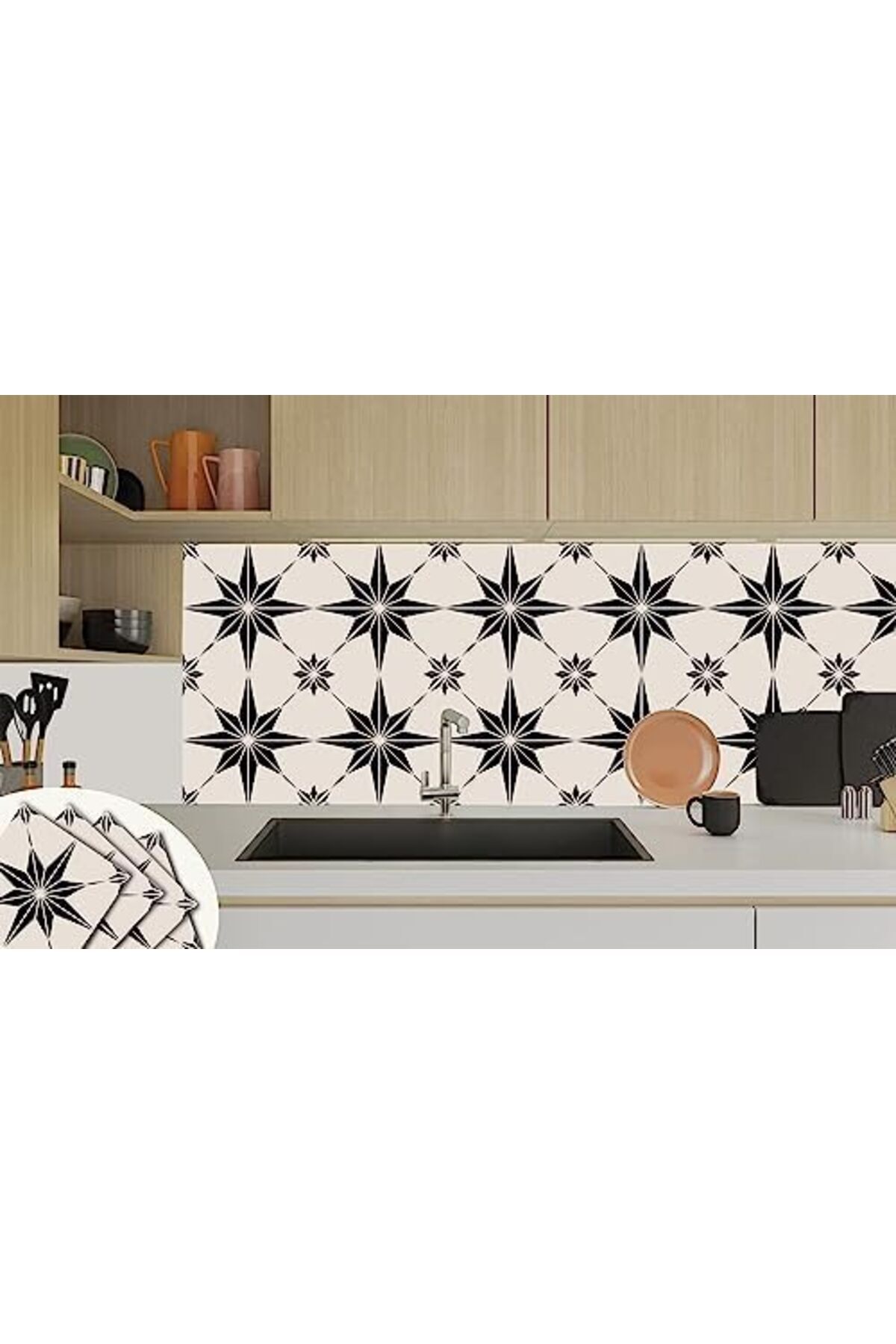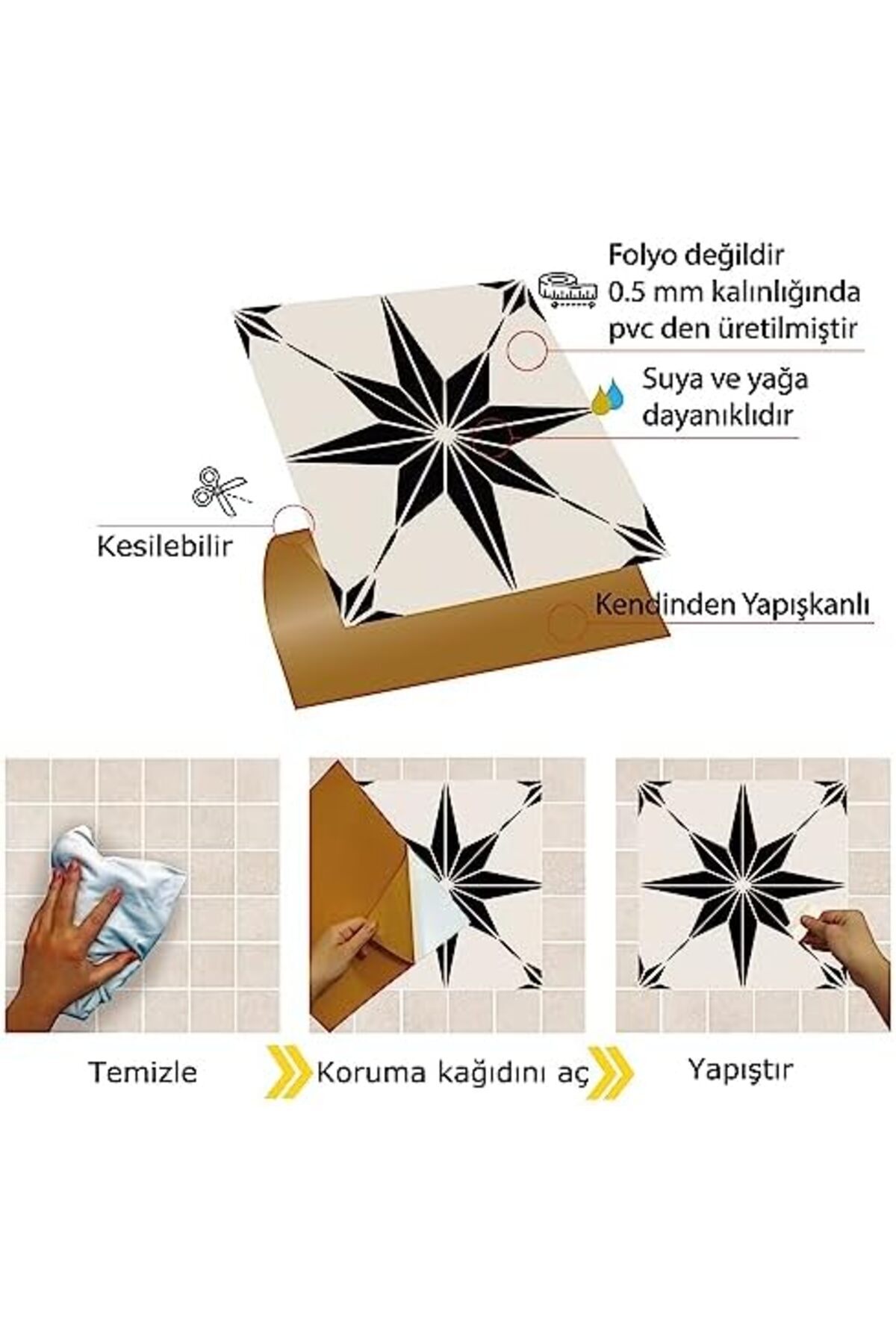 Kendinden Yapışkanlı Çıkartması, Zemin Duvar Kaplama, Yapışkanlı Kaplama PVC Siyah Yıldız Desenli 30x30 cm (56 Adet / 5 m²)