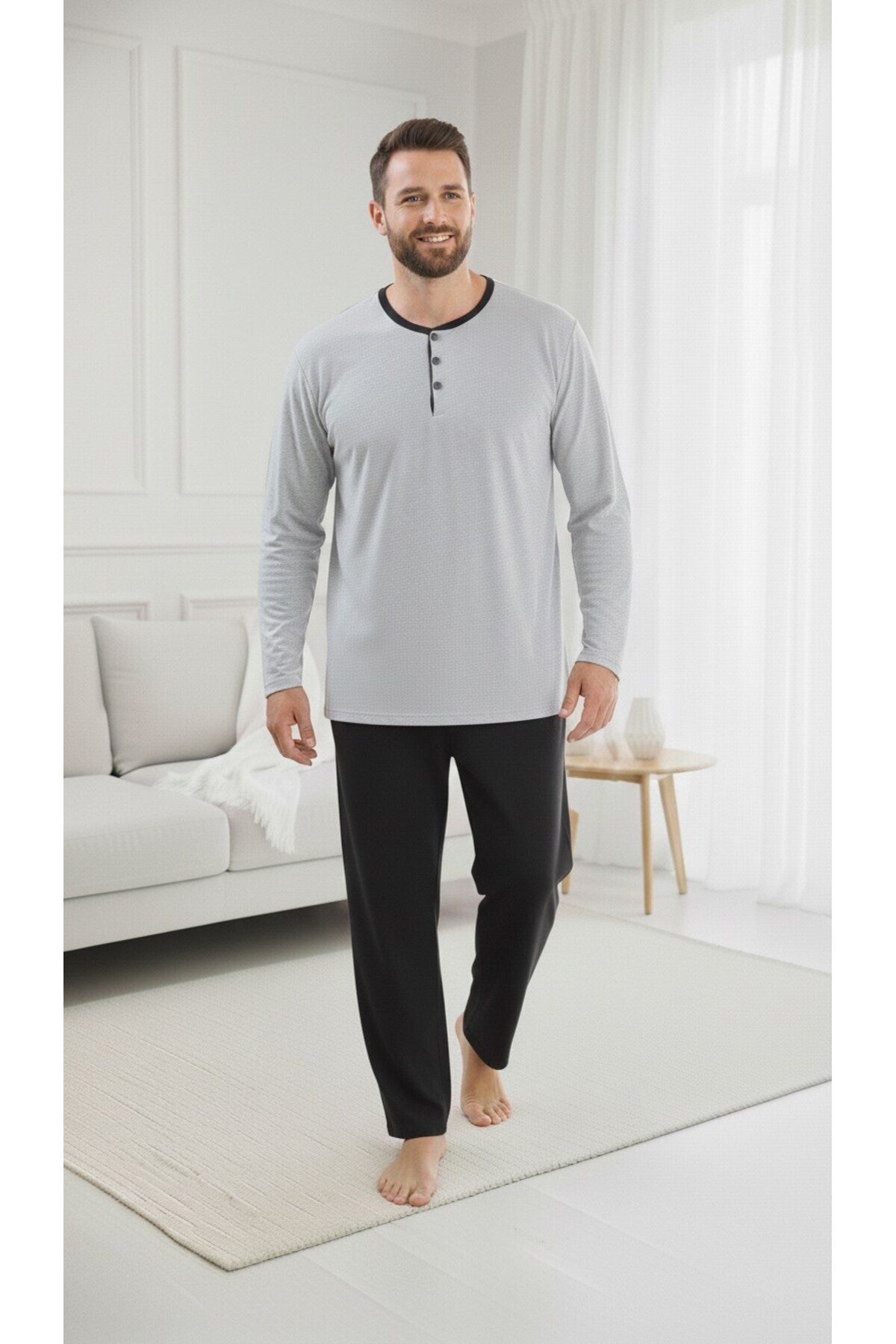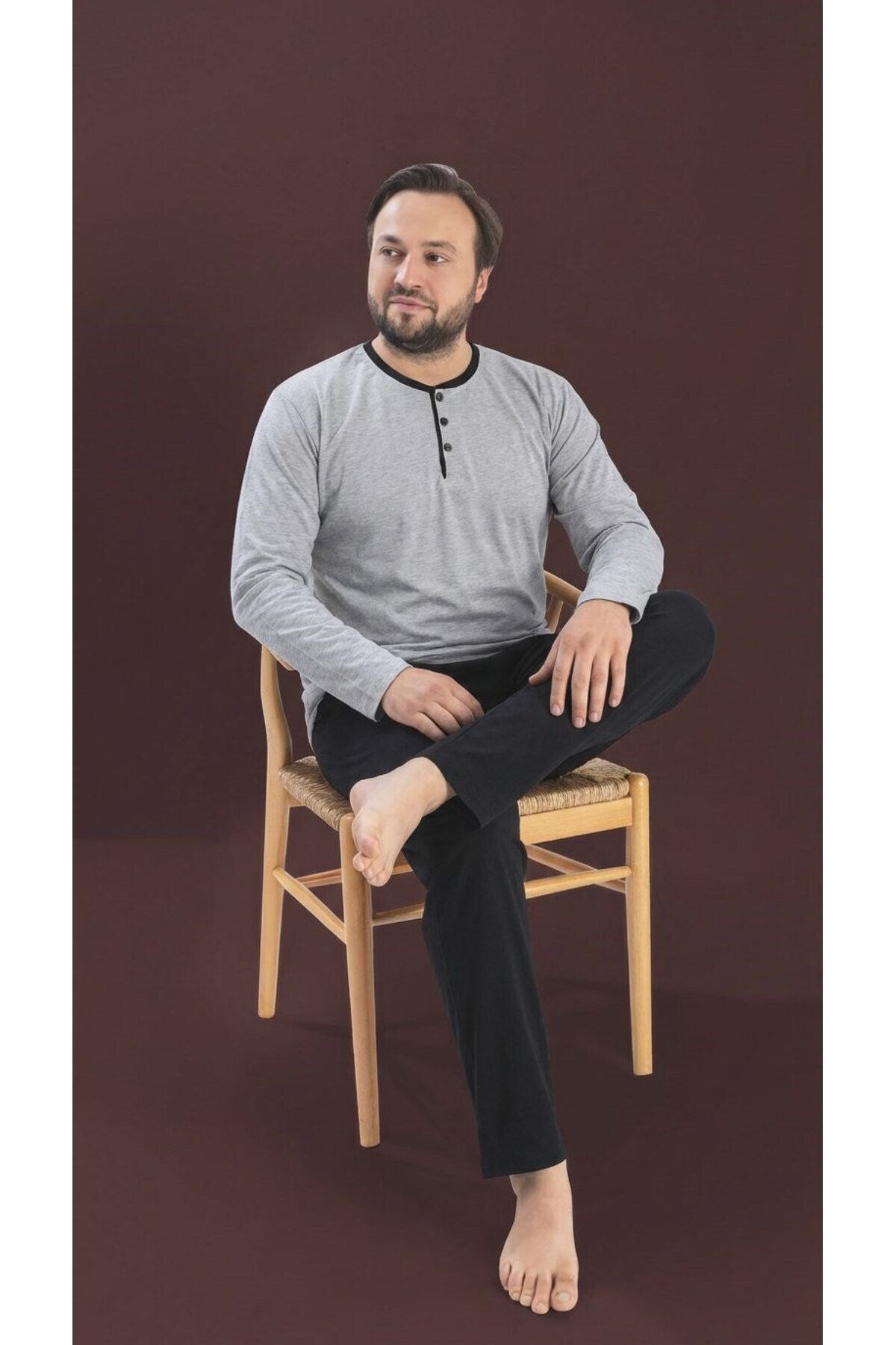 Erkek Büyük Beden Bisiklet Yaka 3 Düğmeli Mevsimlik Uzun Kol Pijama Takımı