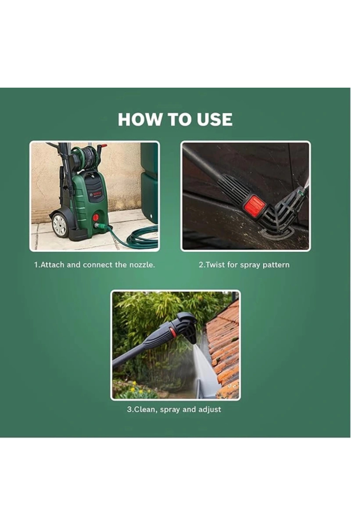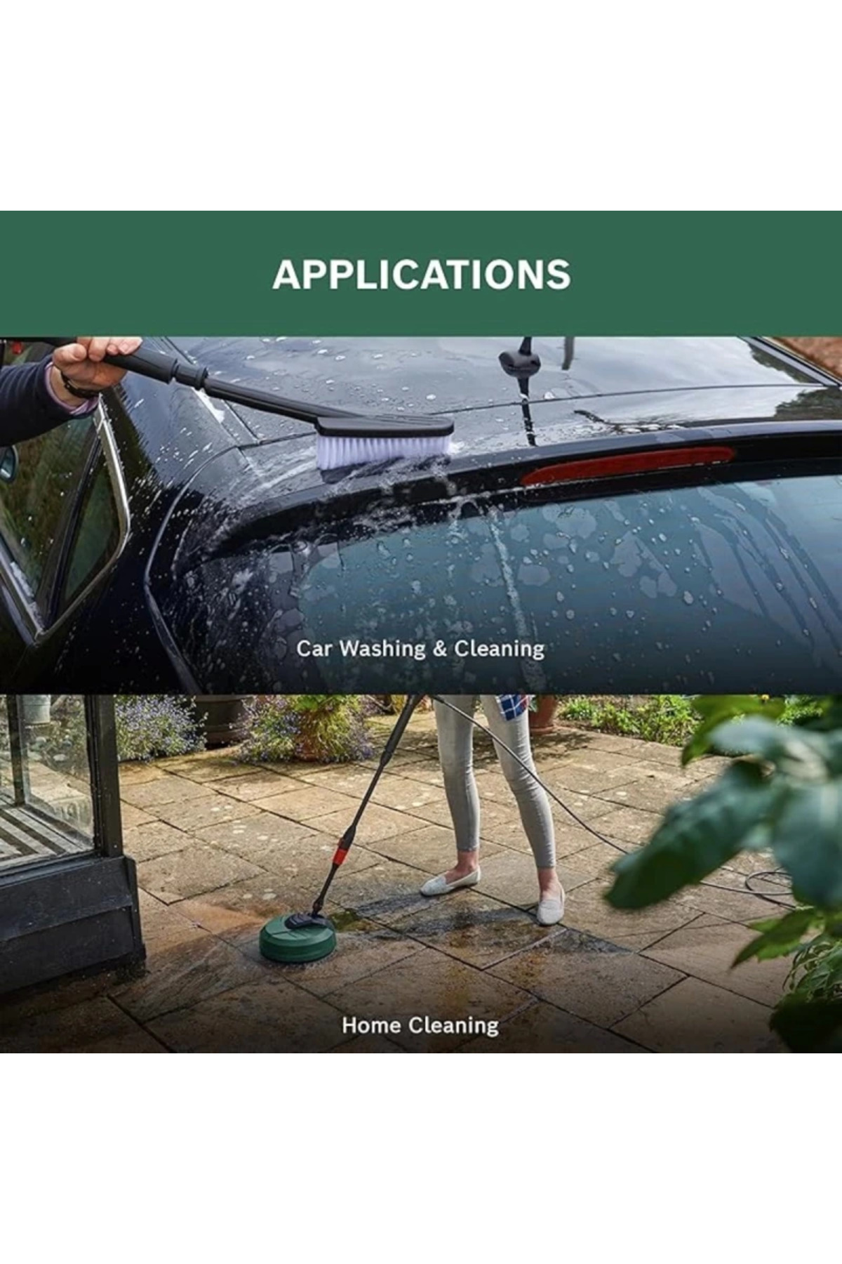 Ev ve araba yıkama kiti Arabalar avlular ve diğer dış yüzeylerdeki kiri zahmetsizce temizler Yumuşak kıllı yıkama fırçası camlardaki ve arabalardaki kiri yok eder 90 püskürtme aparatı ulaşılması zor çamurluk davlumbazları ve oluklardaki kirleri ortadan kaldırır EasyAquatak 100LL110120 UniversalAquatak AQT 3310 AQT 3311 AQT 3512 AQT 3713 AQT 4013 ve AQT 4213 ile uyumlu