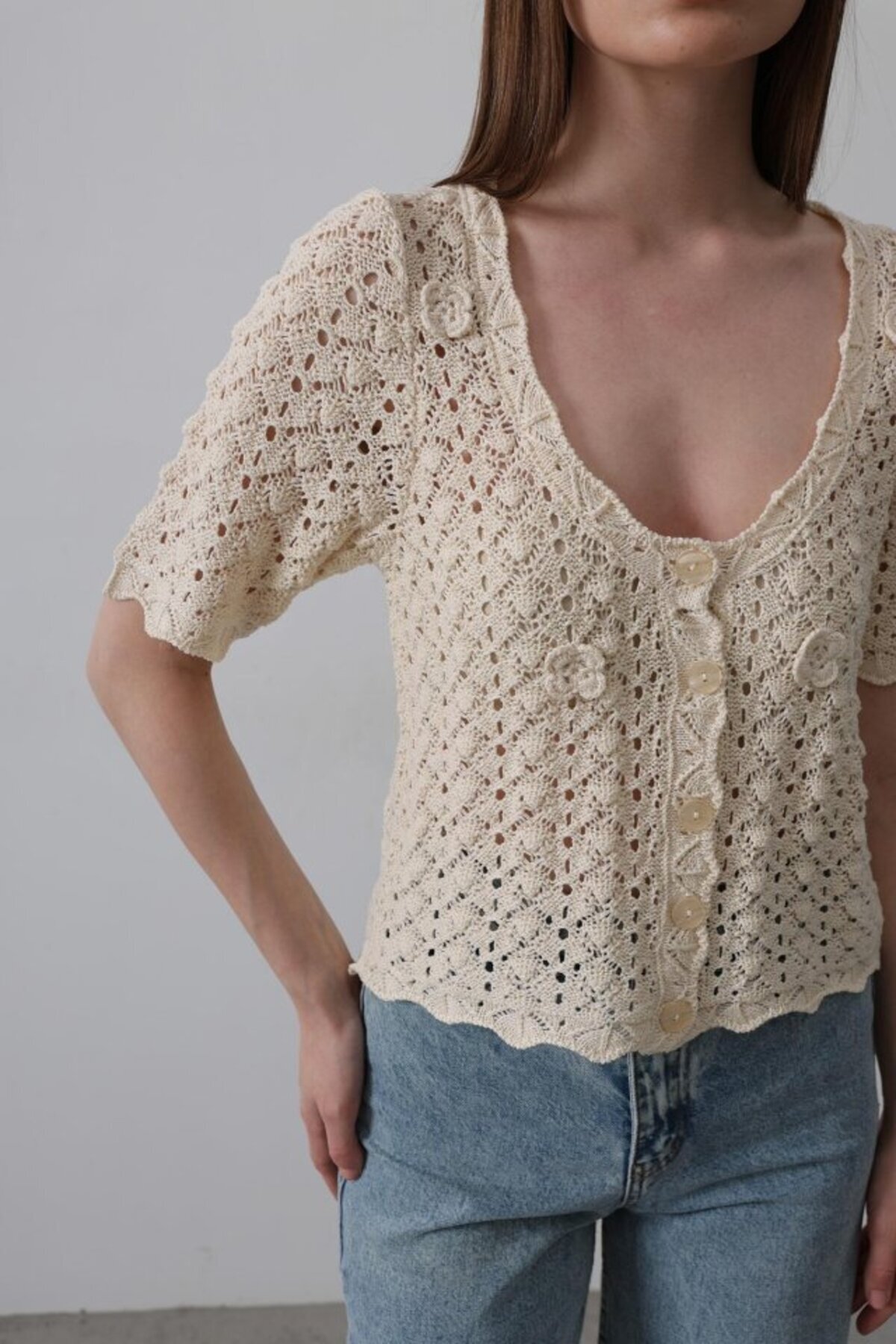 Çiçek Detaylı Düğmeli Triko - Ekru