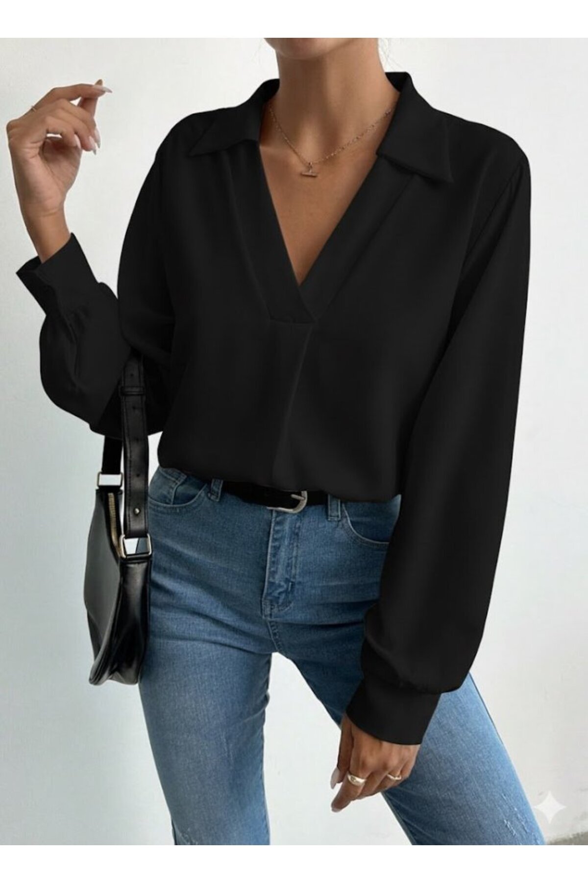 Kadın V Yaka Uzun Kollu Mosskrep Kumaş Bluz