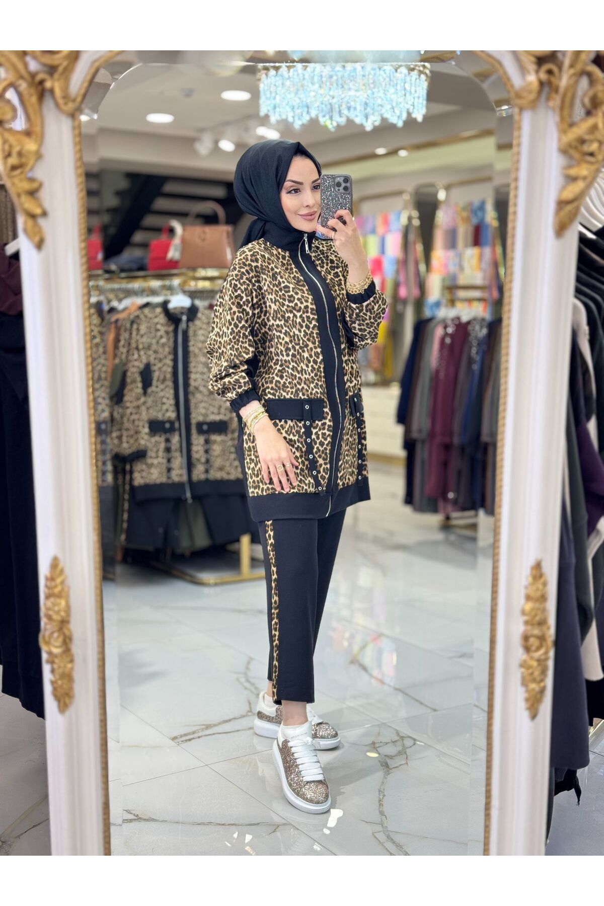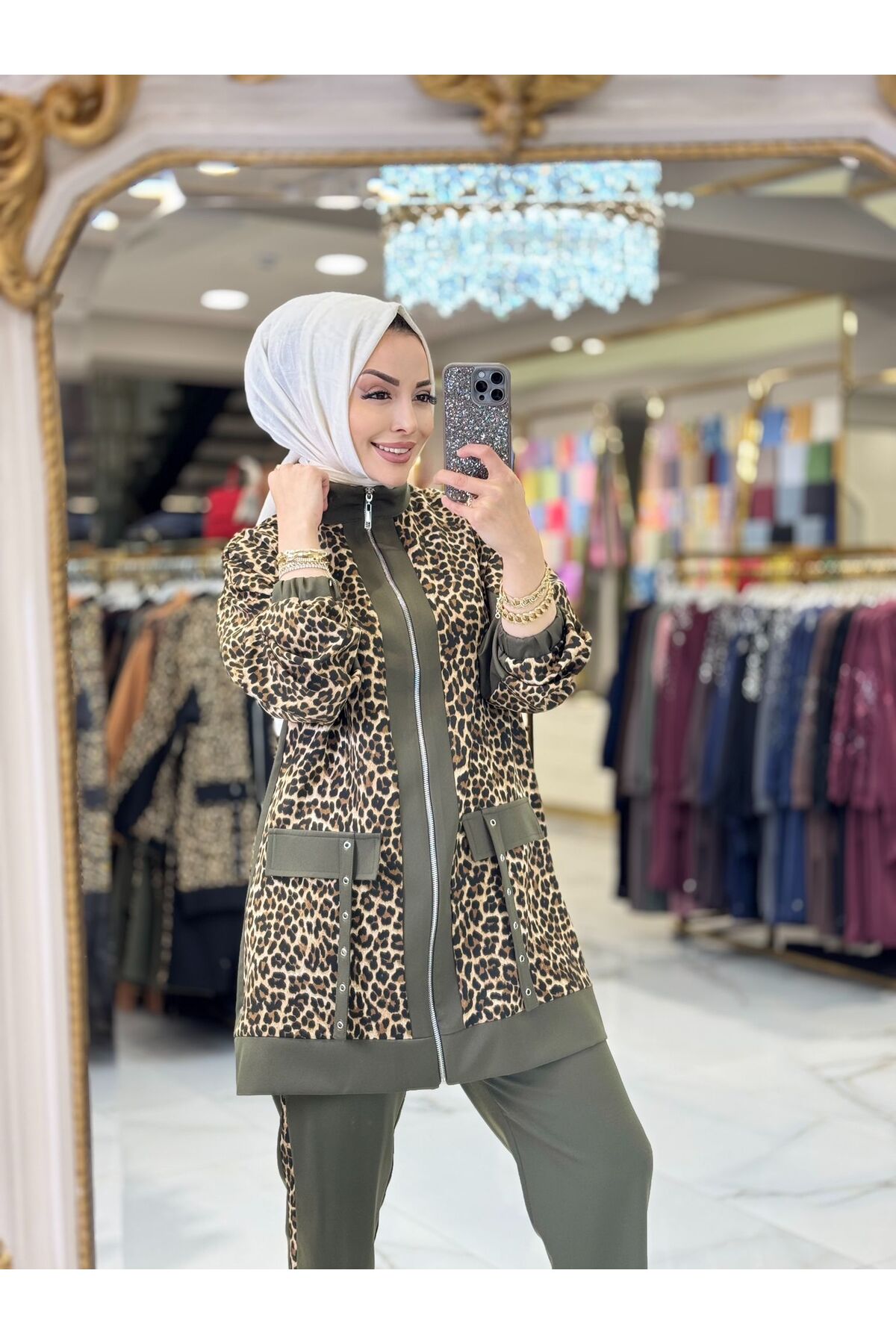 Ürün kodu : 9768 Yeni sezon tuniği ve pantolon yanı leopar desenli, fermuarlı takım modelimiz sizlerle 🥰 1 bd(36-38), 2 bd(40-42), 3 bd(42-44), 4 bd(44-46) Haki ve Siyah Tunik boy 84-86 cm, pantolon boy 96 cm 1. Sınıf scuba kumaş
