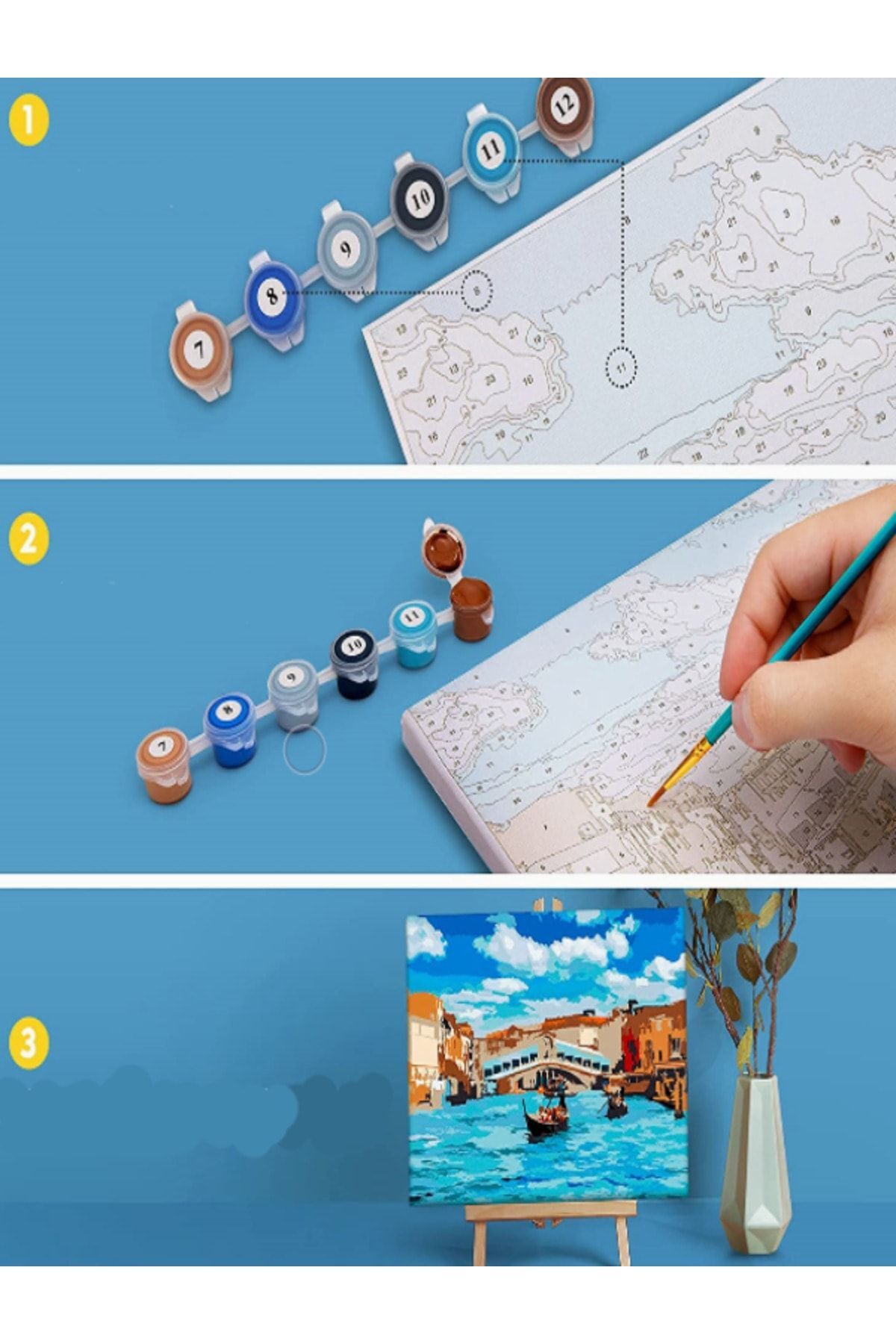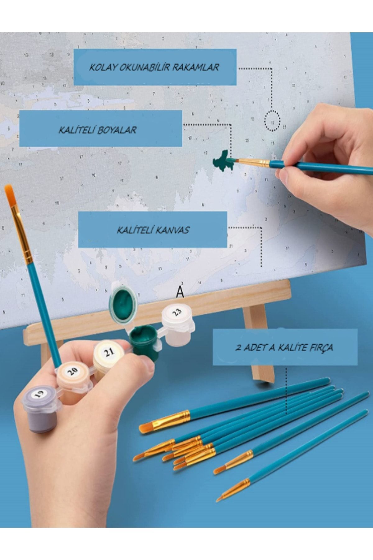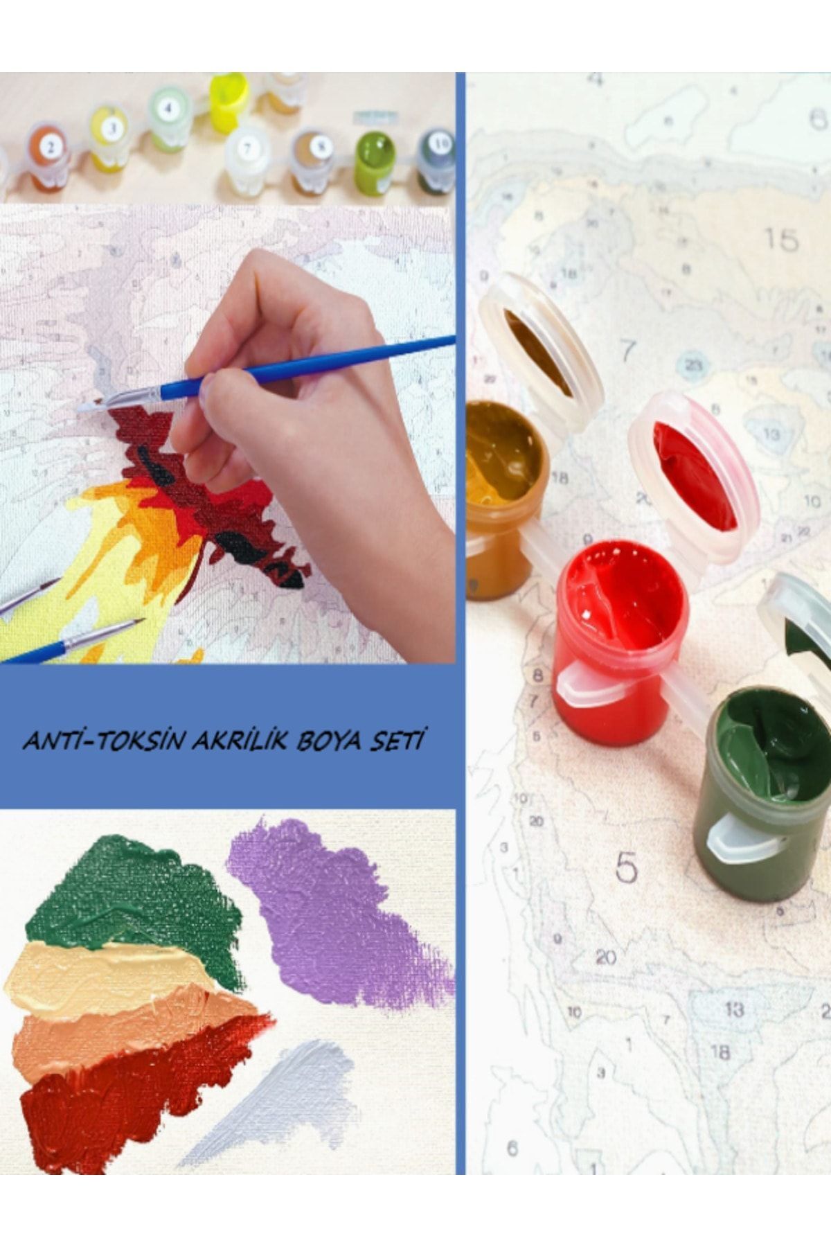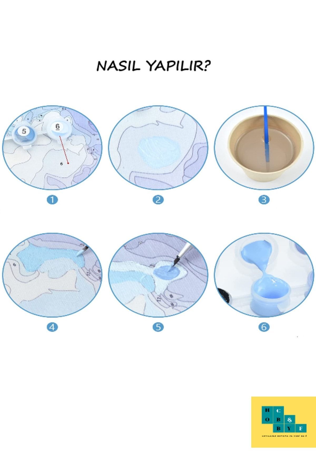 Tuval üzerinde numaralandırılmış olan sayıya göre boya setinden aynı sayı seçilir ve boyama yapılır. Boyama işleminiz bittikten sonra boya kapaklarını sıkıca kapamanız gerekmektedir. Kapak tam kapanmadığı takdirde hava alacak ve kurumaya neden olacaktır.