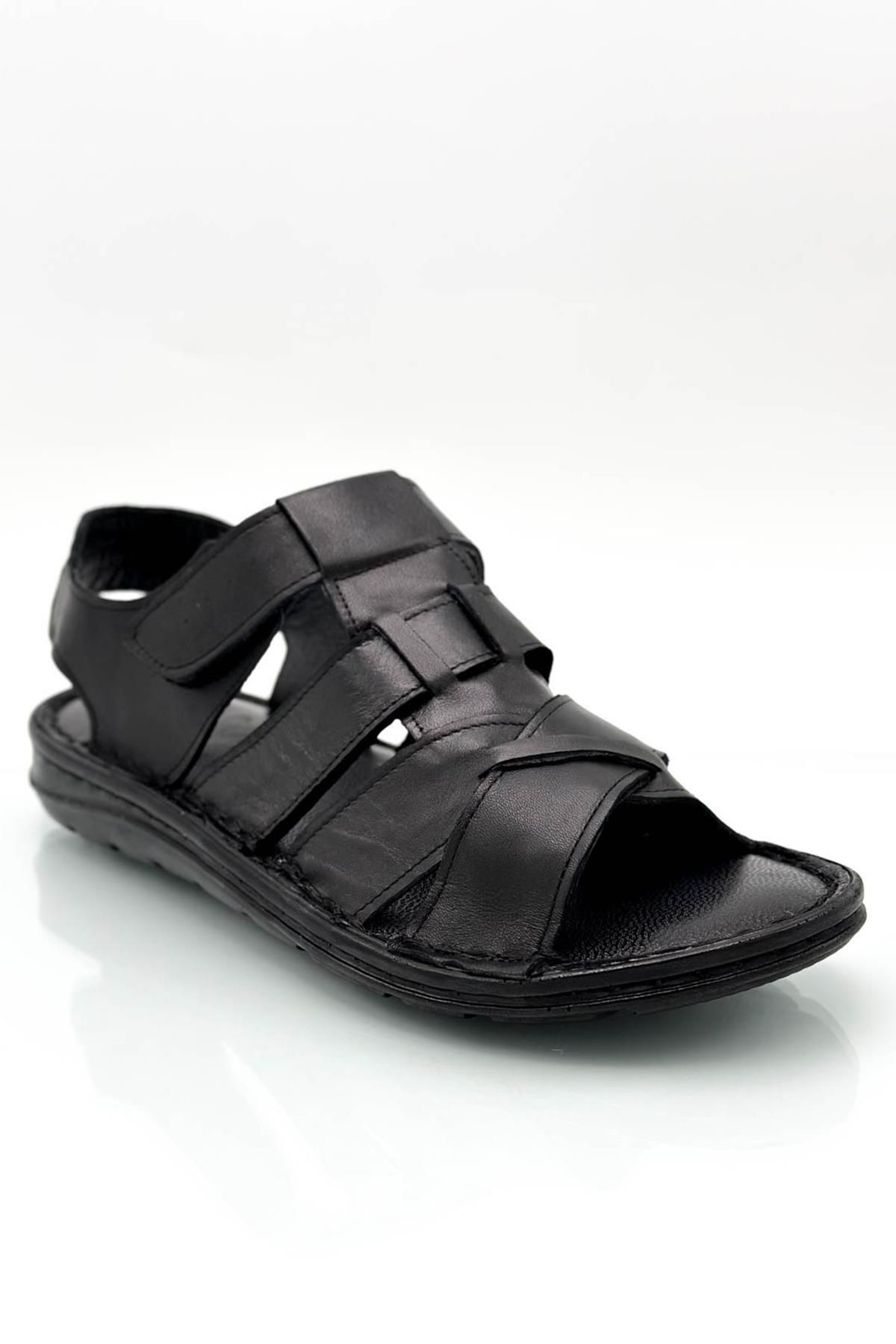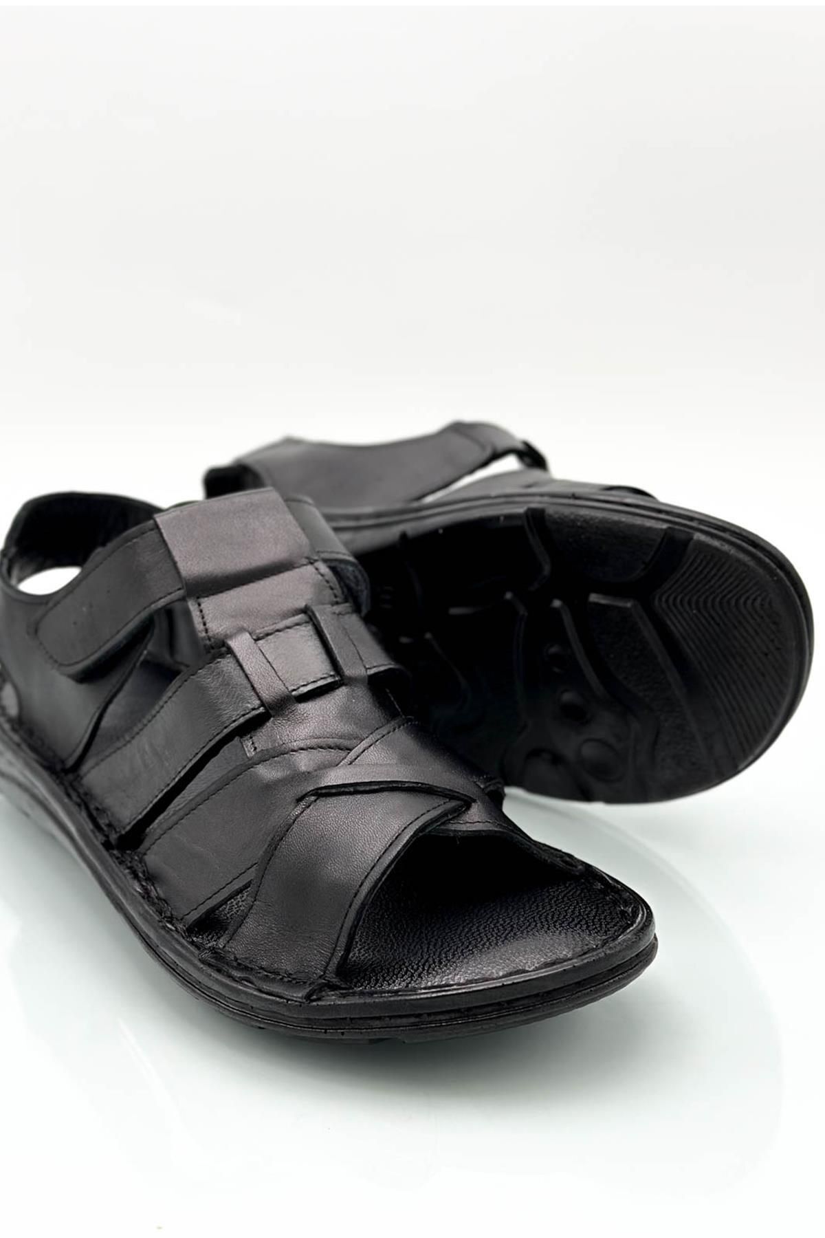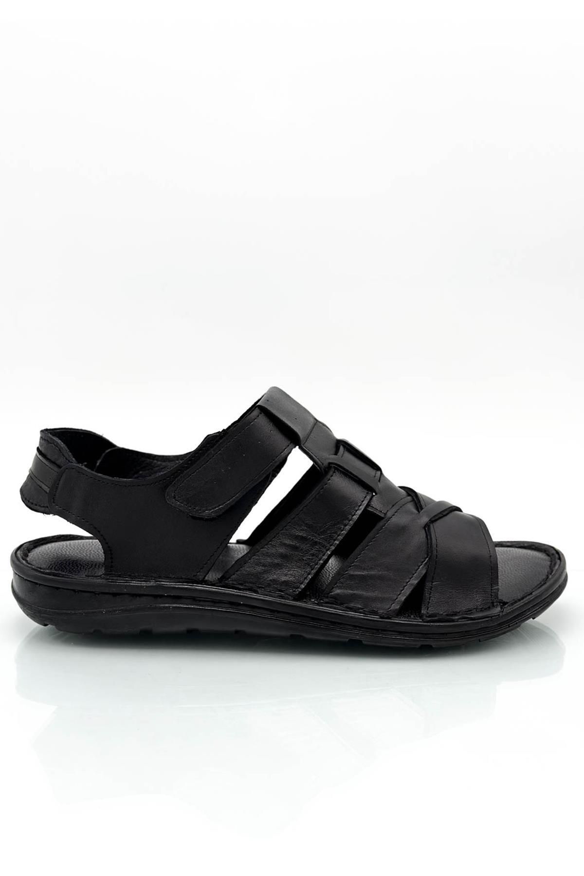 Hakiki Gerçek Deri Cırtlı Erkek Sandalet Çapraz Siyah