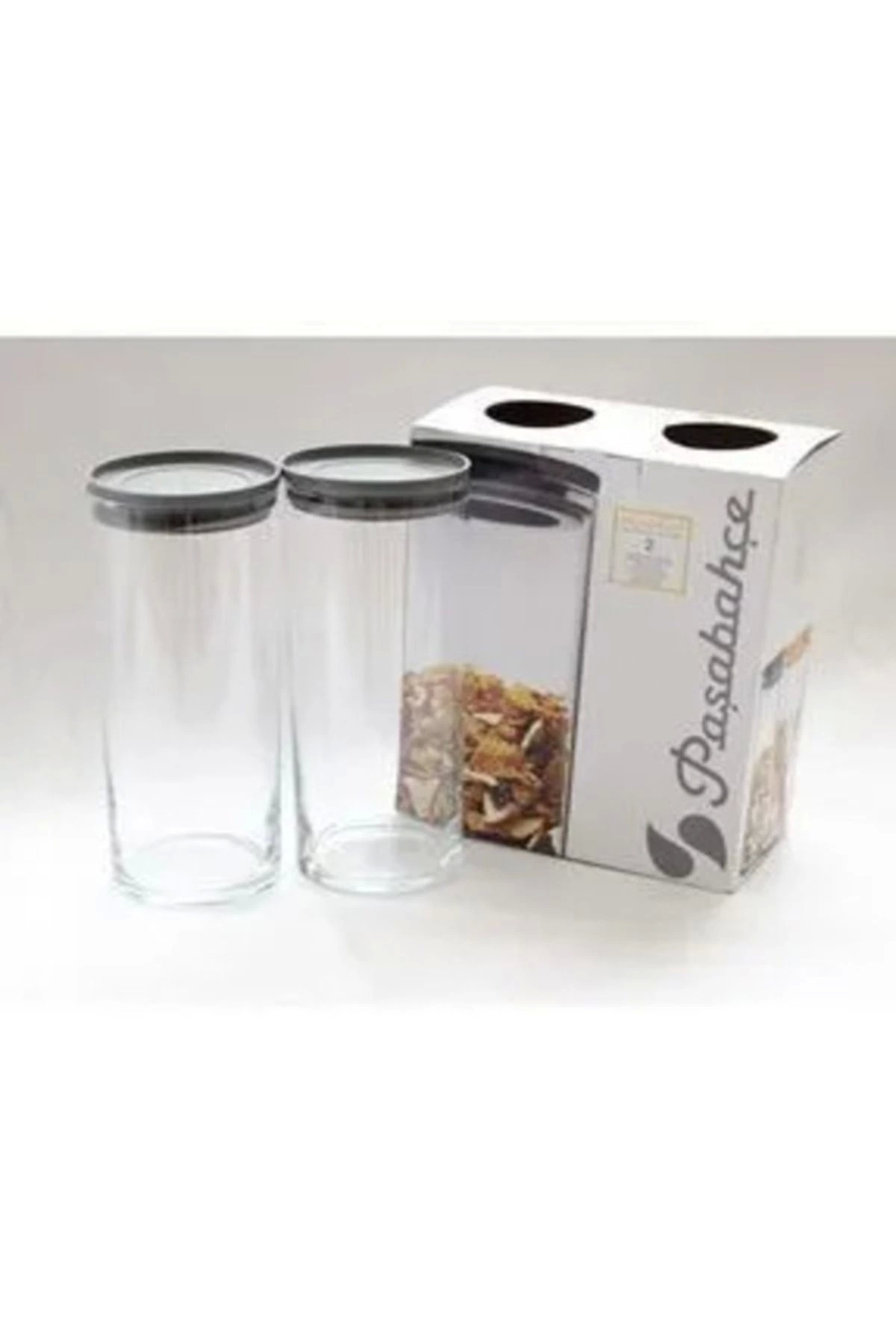 İki adet gri kapaklı cam kavanoz seti, hem estetik hem de pratik bir kullanım sunar.