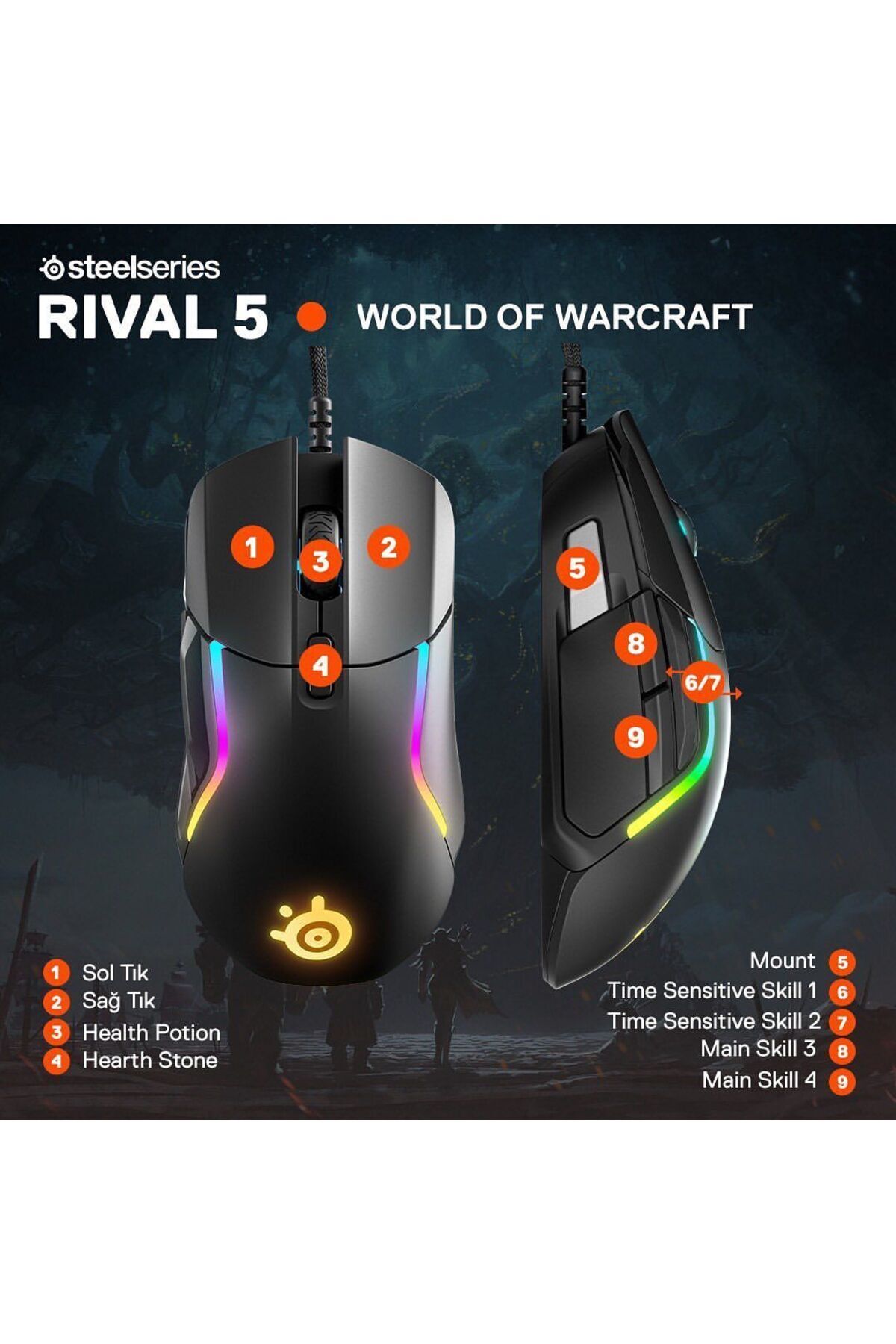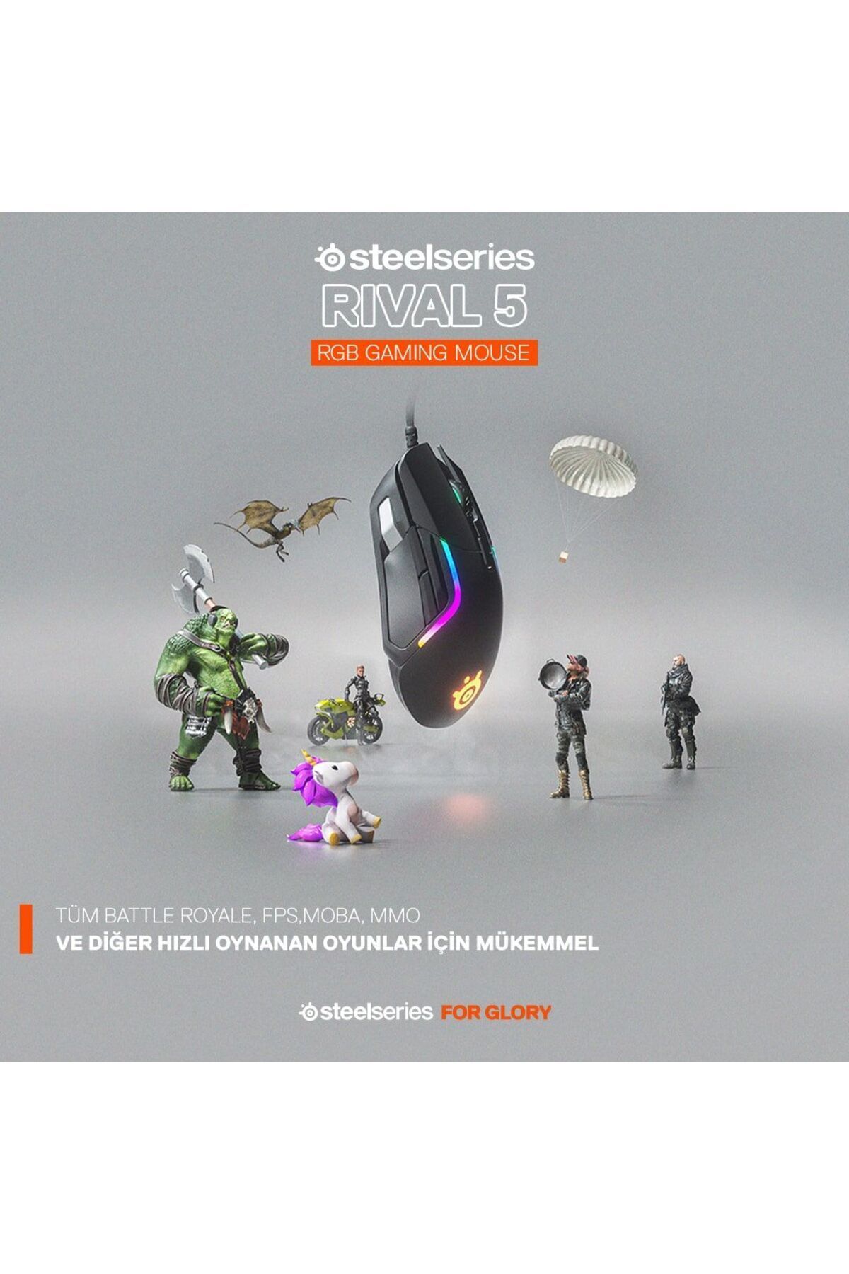 - Rival 5 hafif, hızlı, dayanıklı ve yüksek performanslı olmasını sağlayan gelişmiş mühendislik özellikleri ekstra ağırlık gerekmeksizin birinci sınıf mouse özelliklerinden faydalanmanızı sağlar, böylece saatlerce kesintisiz ve konforlu bir şekilde oyun oynayabilirsiniz