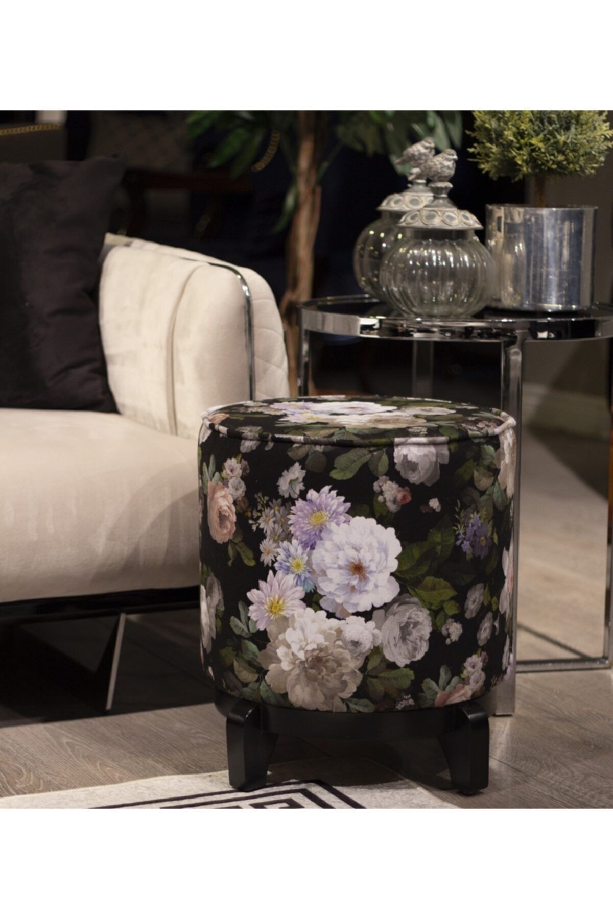 Desenli puf, çiçek desenleri ve siyah renk seçeneği ile pufun her türlü dekorasyon tarzına uyum sağlamasını ve odanıza şıklık katmasını sağlar.